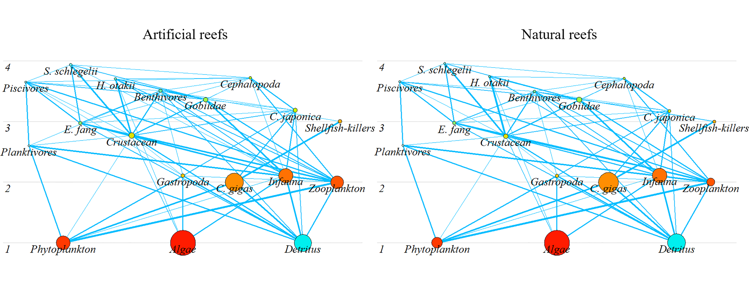 | Piscivores | Lateolabrax japonicus, Pneumatophorus japonicus, Saurida elongata, Scomberomorus niphonius | |