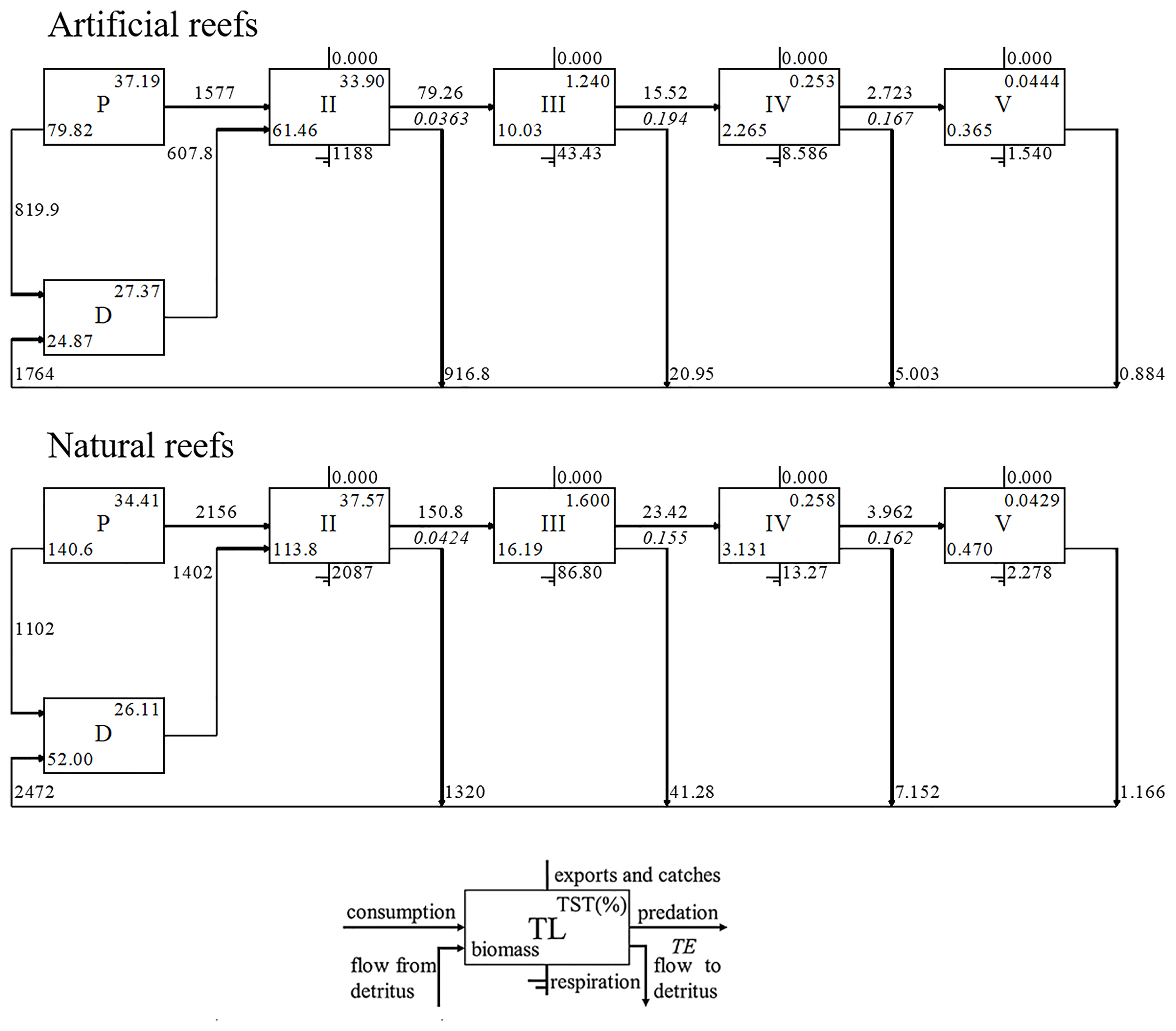 artificial reefs, natural reefs, Ecopath, trophic structure, energy flow