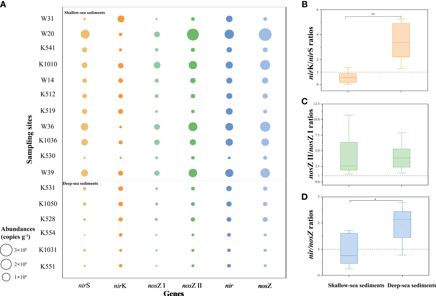 Abundances and ratios of key functional genes for denitrification in surface sediments of SCS. The gene abundances include the nir (nirS and nirK) and nosZ (nosZ I and nosZ II) genes (A), gene ratios include the nirK/nirS gene abundance ratios (B), the nosZ II/nosZ I gene abundance ratios (C) and the nir/nosZ gene abundance ratios (D). The asterisks denoted statistically differences by Mann-Whitney test, two asterisks (**) denotes p < 0.01 and one asterisk (*) denotes p < 0.05.