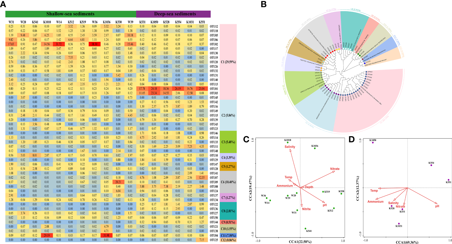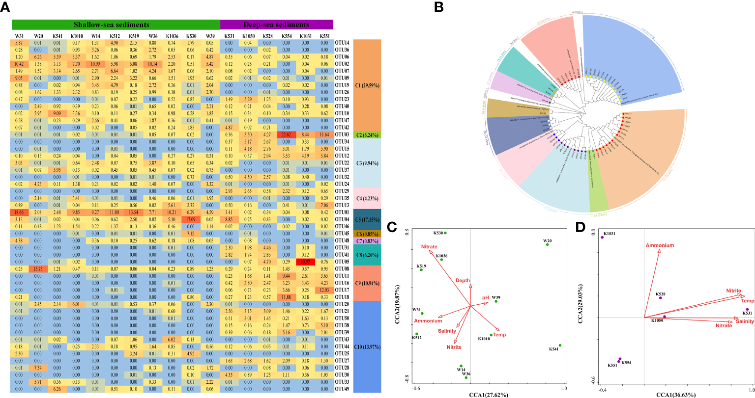 Microbial characteristics of the nirS gene in surface sediments of the northern SCS. (A) The heat map of dominant OTUs for the nirS gene (Top 50 OTUs). (B) Neighbor-joining phylogenetic tree of dominant OTUs for the nirS gene (Top 50 OTUs) and the reference sequences from Genbank (bootstrap 1000). (C) The canonical correspondence analysis (CCA) for the nirS gene derived from shallow-sea surface sediments. (D) The canonical correspondence analysis (CCA) for the nirS gene derived from deep-sea surface sediments.