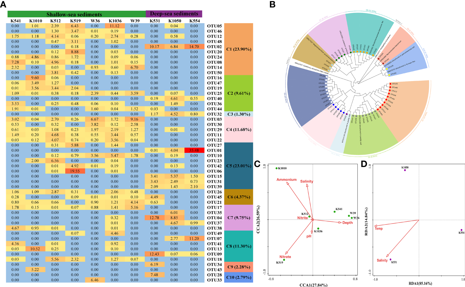 Microbial characteristics of the nosZ II gene in surface sediments of the northern SCS. (A) The heat map of dominant OTUs (Top 50 OTUs). (B) Neighbor-joining phylogenetic tree of dominant OTUs (Top 50 OTUs) and the reference sequences from Genbank (bootstrap 1000). (C) The canonical correspondence analysis (CCA) for the nosZ II gene from shallow-sea surface sediments. (D) The redundancy analysis (RDA) for the nosZ II gene from deep-sea surface sediments.