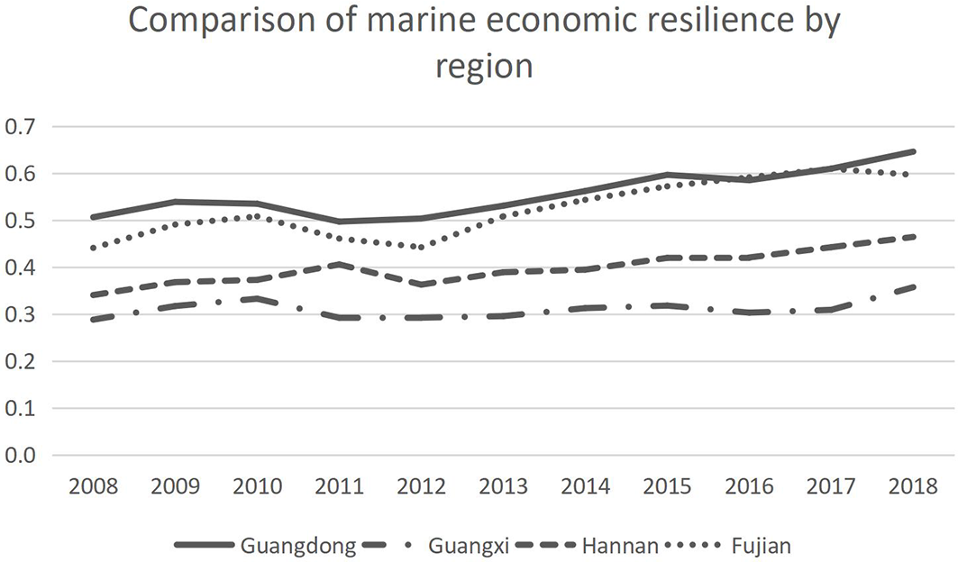 As an important part of the national economy, the marine economy will be subject to various internal and external disturbances in the process of development. Different regions will show different resilience. Based on four dimensions of “resistance–recovery–reorientation–renewal,” this paper measures the marine economic resilience of the four provinces covered within the China’s Southern Marine Economy Circle from 2008 to 2018 by establishing an evaluation index system. The results show that 1) the overall resilience of economy in the Southern Marine Economy Circle showed a fluctuating upward trend from 2008 to 2018. Although there was a decline in 2011–2012 due to natural disasters, the value quickly resumed its increasing trend. 2) At present, there are obvious relative differences in the resilience of marine economy in each region of China’s Southern Marine Economy Circle, and the polarization phenomenon is serious. Among them, Guangdong belongs to the high-value region and Fujian is in the middle, while Hainan and Guangxi are temporarily in the low-value area.