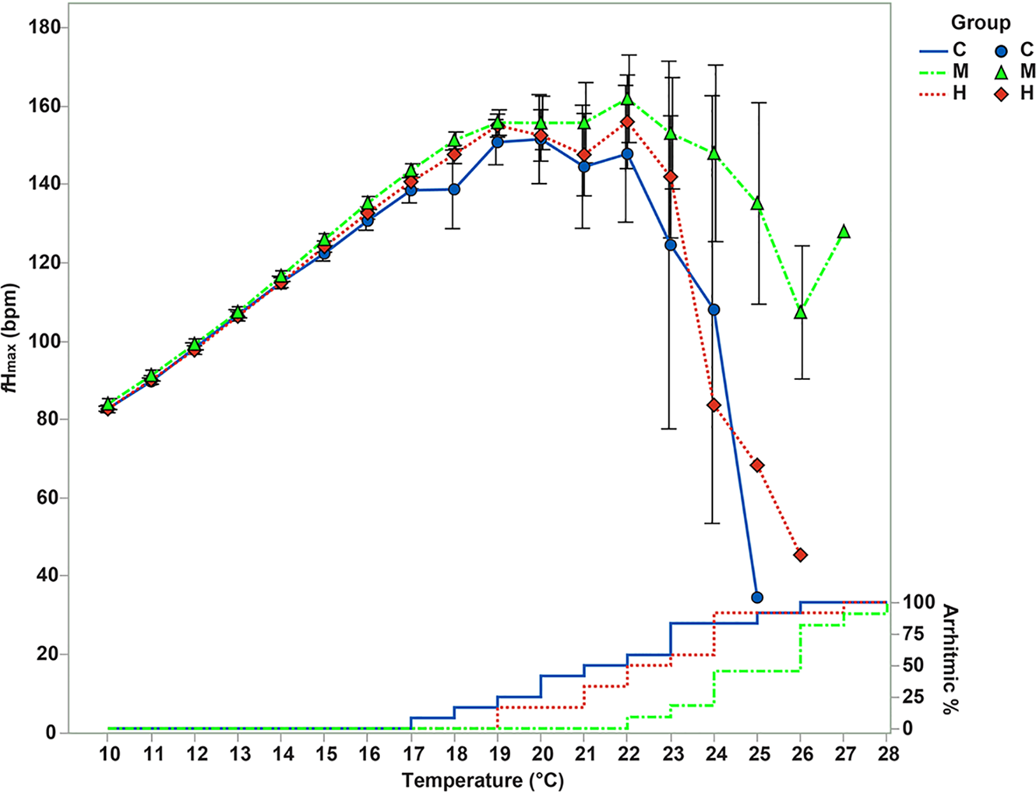The effects of training programmes on the maximal heart rate (fHmax) during acute warming. The average ( ± s.e.) fHmax of the three training groups (Control=C, blue circles, n=12; Medium intensity=M, green triangles, n=11; High intensity=H, red squares, n=12) during acute warming challenge. The lines on the right side represent the percent of the fish that developed cardiac arrhythmia at the corresponding temperature steps.