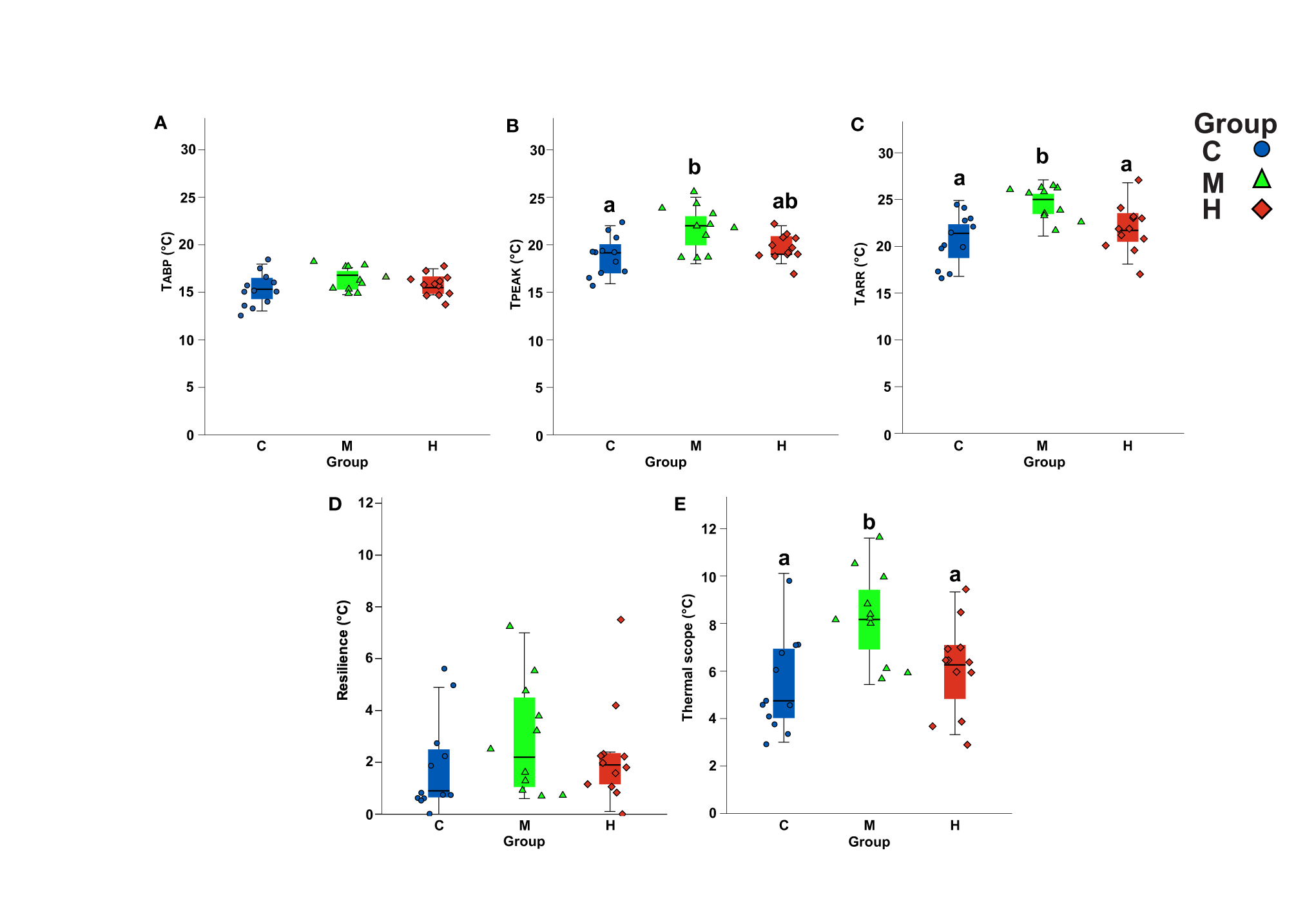 The effects of training programmes on the cardiac transition temperatures. Boxplots of the Arrhenius break point temperature (TABP) the fHmax(A), the temperature where the fish achieved the peak of the fHmax (Tpeak) (B), the temperature where the fish developed the arrhythmia (TARR) (C), the scope of the heart thermal resilience (D), and the thermal scope of the heart function (E). The different letters represent significant difference (p < 0.05) among the groups (Control=C, blue circles, n=12; Medium intensity=M, green triangles, n=11; High intensity=H, red squares, n=12).