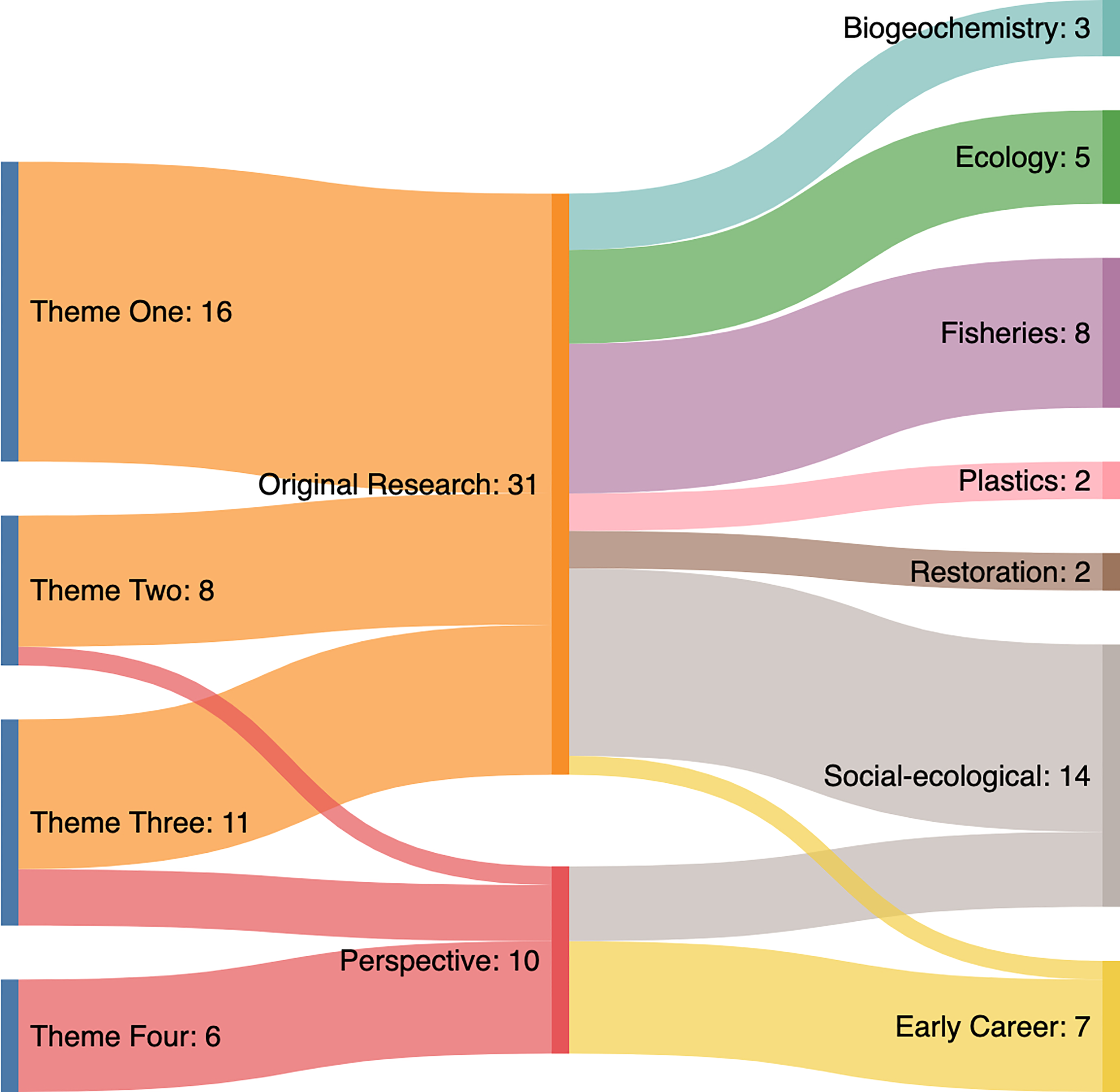 Early Career Researchers (ECRs) are at the forefront of this new research agenda, and this Research Topic showcases the diversity of research undertaken by the next generation of marine scientists. We received 41 contributions which included first authors from 18 different countries. Themes of contributed papers include: (1) understanding and quantifying the state and variability of marine ecosystems; (2) improving scenarios, predictions, and projections of ocean-human systems at multiple scales; (3) improving and achieving sustainable marine governance; and (4) perspectives on ECRs’ role in solving grand ocean challenges (Figure 1). The papers in this special issue highlight the wide-reaching and interdisciplinary nature of ECRs in identifying and developing innovative solutions to challenges associated with rapid changes in the world’s coastal zones and oceans. We conclude that maximising the contributions of ECRs to interdisciplinary marine research requires the development of impact-based performance metrics (i.e. those that go beyond traditional publication-based metrics), building effective interdisciplinary institutional capacity, promoting diversity, equity, and inclusion, and integrating ECRs into global research efforts. This will help to unlock the full potential of ECRs to aid efforts to safeguard the future of marine environments for all of society and ensure a broader and more inclusive perspective. This is particularly pertinent as we enter the United Nations Decade of Ocean Science for Sustainable Development (2021-2030).