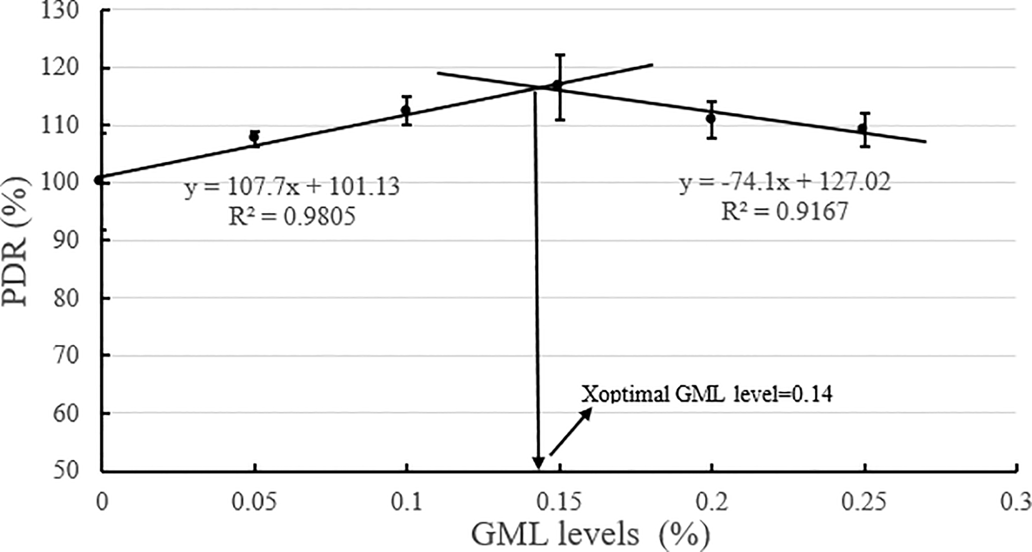 Effects of different GML levels on the PDR for juvenile pompano T. ovatus (n = 3). Based on the broken-line model of PDR corresponding to GML levels (y =107.7x + 101.13, R2 = 0.9805; y = −74.1x + 127.02, R2 = 0.9167), the optimum addition level of dietary GML was estimated to be 0.14%.
