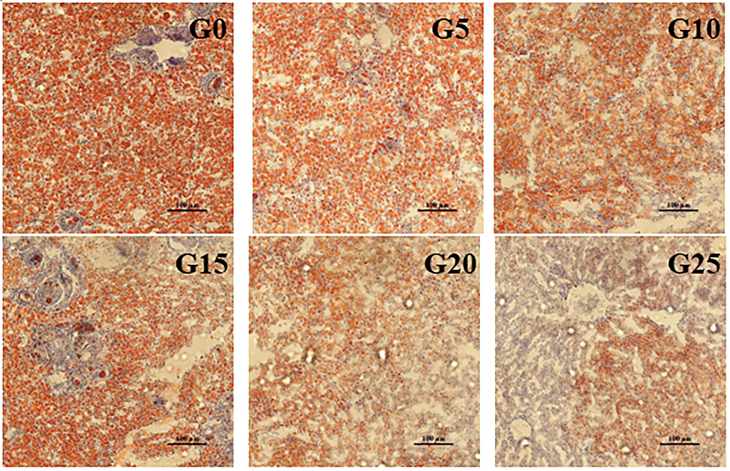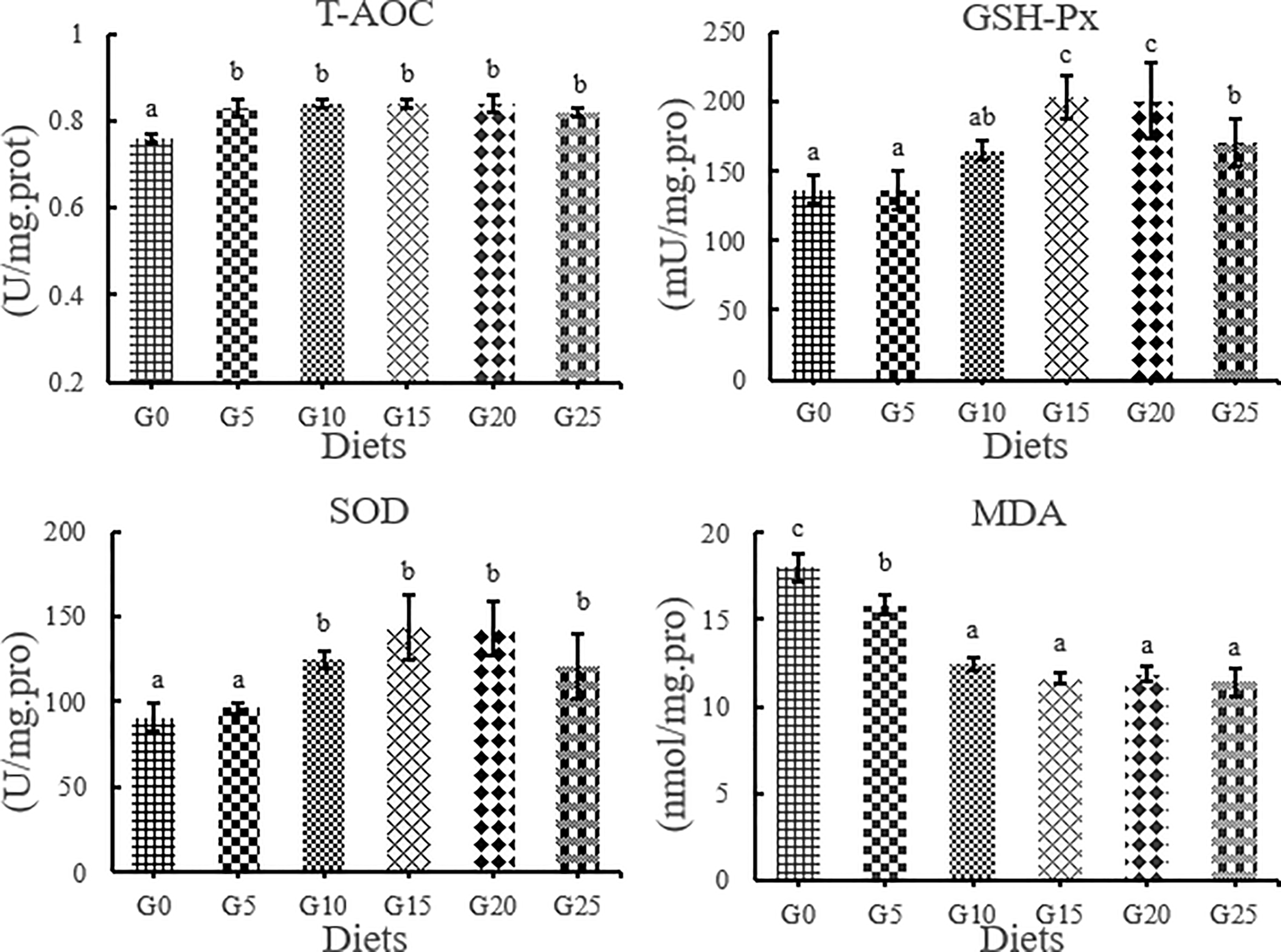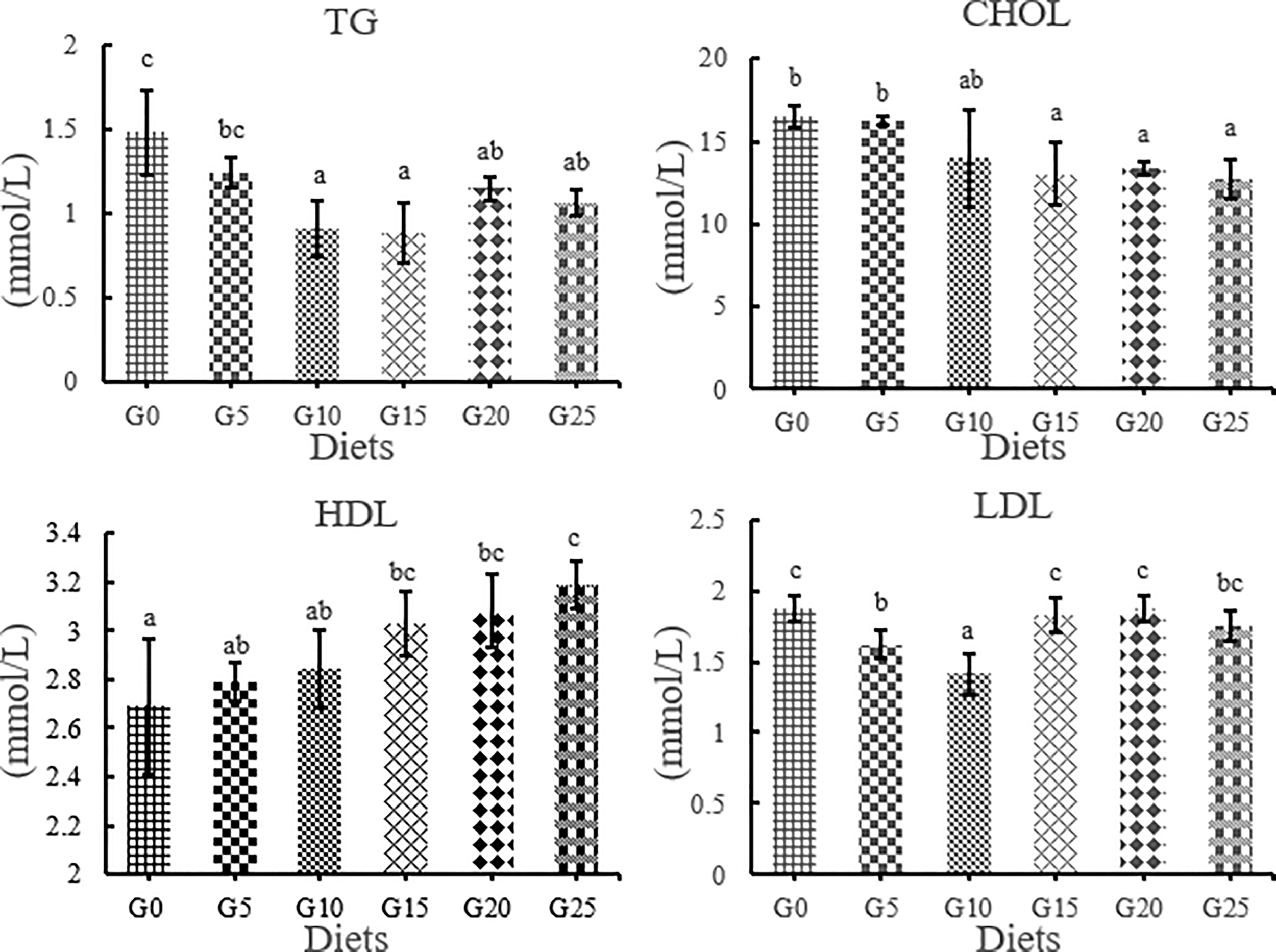 The crude protein of body composition was significantly higher in the G15 group than in the other groups (P < 0.05; Table 3). The crude lipid of body composition was significantly lower in the G10, G15, and G20 groups than in the G0 group (P < 0.05). The crude lipid in the livers in the G10, G15, G20, and G25 groups was significantly lower than in the G0 group (P < 0.05), whereas no significant differences were observed in muscle crude lipid (P > 0.05). No significant differences were found in the crude ash and moisture of the body composition (P > 0.05).