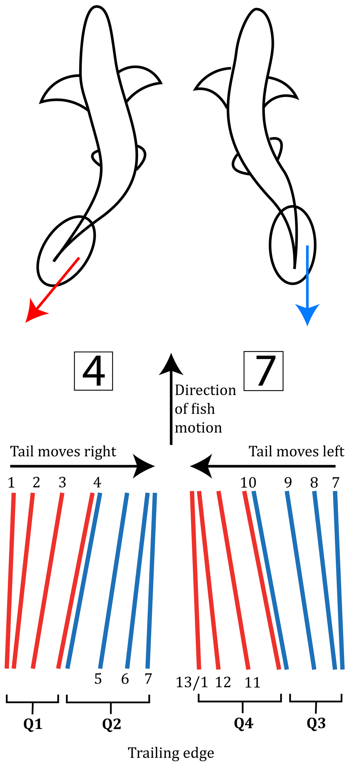Schematic illustration of the fin motion in respect to the fish during locomotion. The bottom figure represents the oscillatory phases, adapted from refs (Lighthill, M. J. (1969). L indicates the force normal to the direction of tail motion (equivalent to lift in airfoils), and D is the force acting in the direction of motion (i.e.: drag). Qi (i = 1 - 4) indicates quadrants of the motion as function of angle of attack; during Q1: the tail’s angle of attack increases while the tail moves to the right, Q2: the tail’s angle of attack decreases whilst the tail keeps moving right and Q3 and Q4 are similar during the tail motion moving to the left (back to complete the cycle).