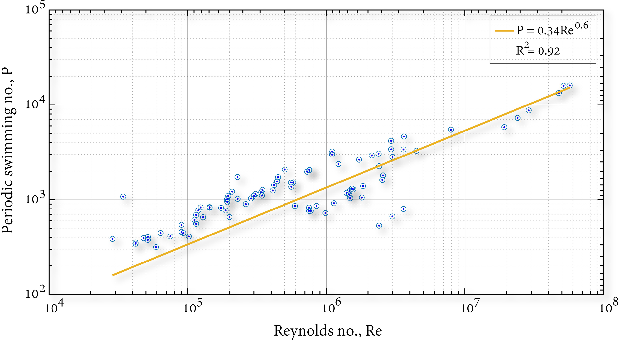 The periodic swimming number ranges between 100 - 10,000. The range narrowing as compared to the classical Reynolds number (based on the fish length) range suggests that the flow phenomena observed during fish locomotion at cruising speeds over range of species are well described by the P number (see Figure 2). Furthermore, this range suggests that that fish-fluid interaction is dominated by three mechanisms: inertia, viscous and unsteadiness. The latter is ignored when using Reynolds number for the flow characterization over a large range of species. Given the narrow range, we cannot ignore the unsteadiness; thus, all three mechanisms should be considered when researching fish locomotion. In Figure 2 we see an empirical exponential connection between P and Re, which quantifies the compression of data from over several decades.
