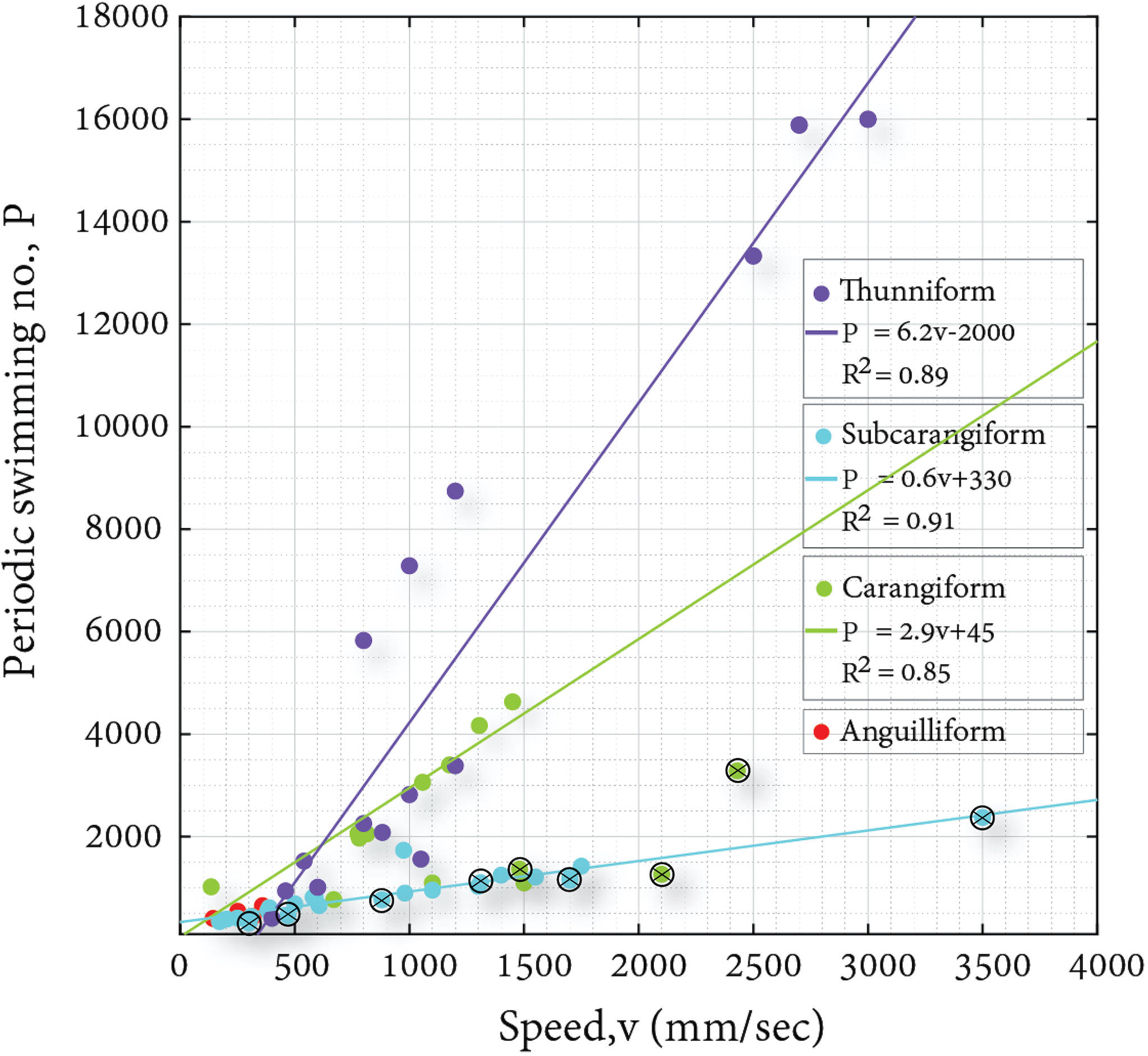 Periodic swimming number vs. speed (top) cluster based on mode of locomotion. Straight lines represent linear fit for the different points. Open black circles with an internal cross correspond to data points where the oscillation frequency was estimated based on speed and length correlation provided by Webb et al. (1984).