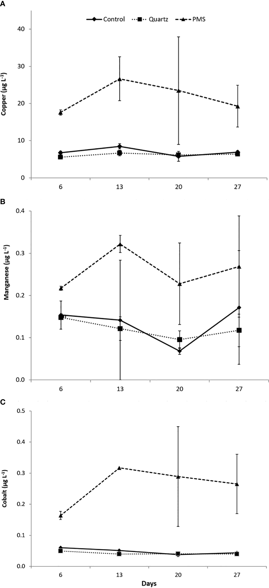 (A-C) Trace metal concentration in seawater in the treatments with polymetallic sulphide particles (PMS), with quartz particles (Quartz) and a control treatment with no sediment addition at times 6,13, 20 and 27 days of the experiment. N=2, data expressed as mean ± standard deviation.