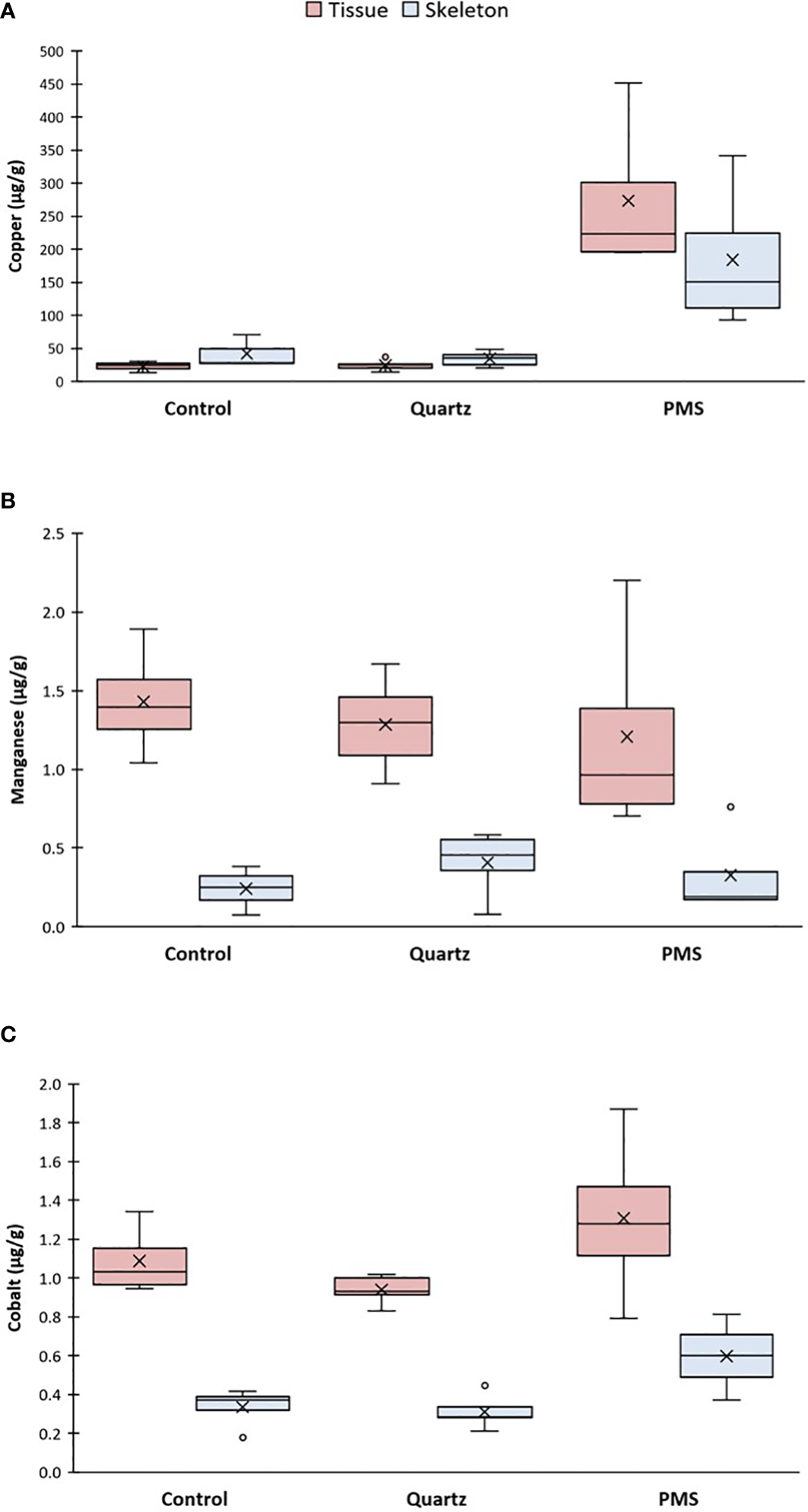 (A-C) Metal accumulation in tissue and skeleton fractions of Dentomuricea aff. meteor exposed to the treatments with polymetallic sulphide particles (PMS), with quartz particles (Quartz), and a control treatment with no sediment addition, at times 25-27 days for PMS and 27 days for control and quartz. N=4-5, data presented as µg−1 dry weight tissue or skeleton. The line in the box is the median, and the X is the mean. Whiskers represent the highest and lowest values and outliers are identified by a circle (○).