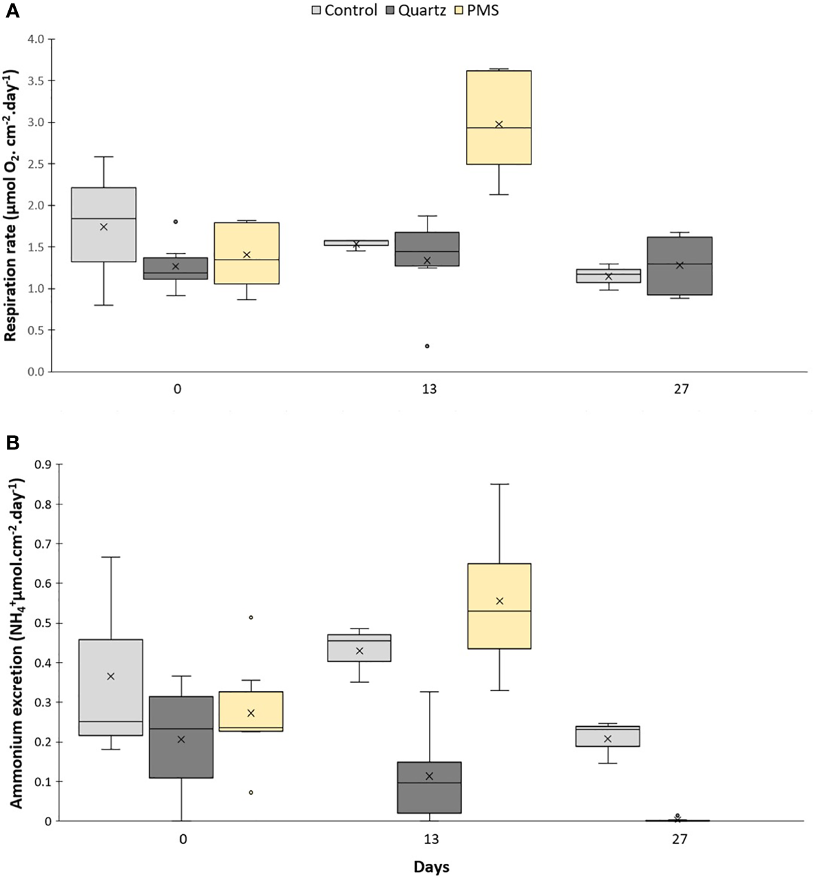 Physiological measurements on the cold-water octocoral Dentomuricea aff. meteor. (A) respiration and (B) ammonium excretion rates during the experiment (times 0, 13, 27) in treatments with polymetallic sulphide particles (PMS), with quartz particles (Quartz), and a control treatment with no sediment addition. Data normalized to coral surface area. N=3-6, no fragments in the PMS treatment at time 27 days. The line in the box is the median, and the X is the mean. Whiskers represent the highest and lowest values and outliers are identified by a circle (○).