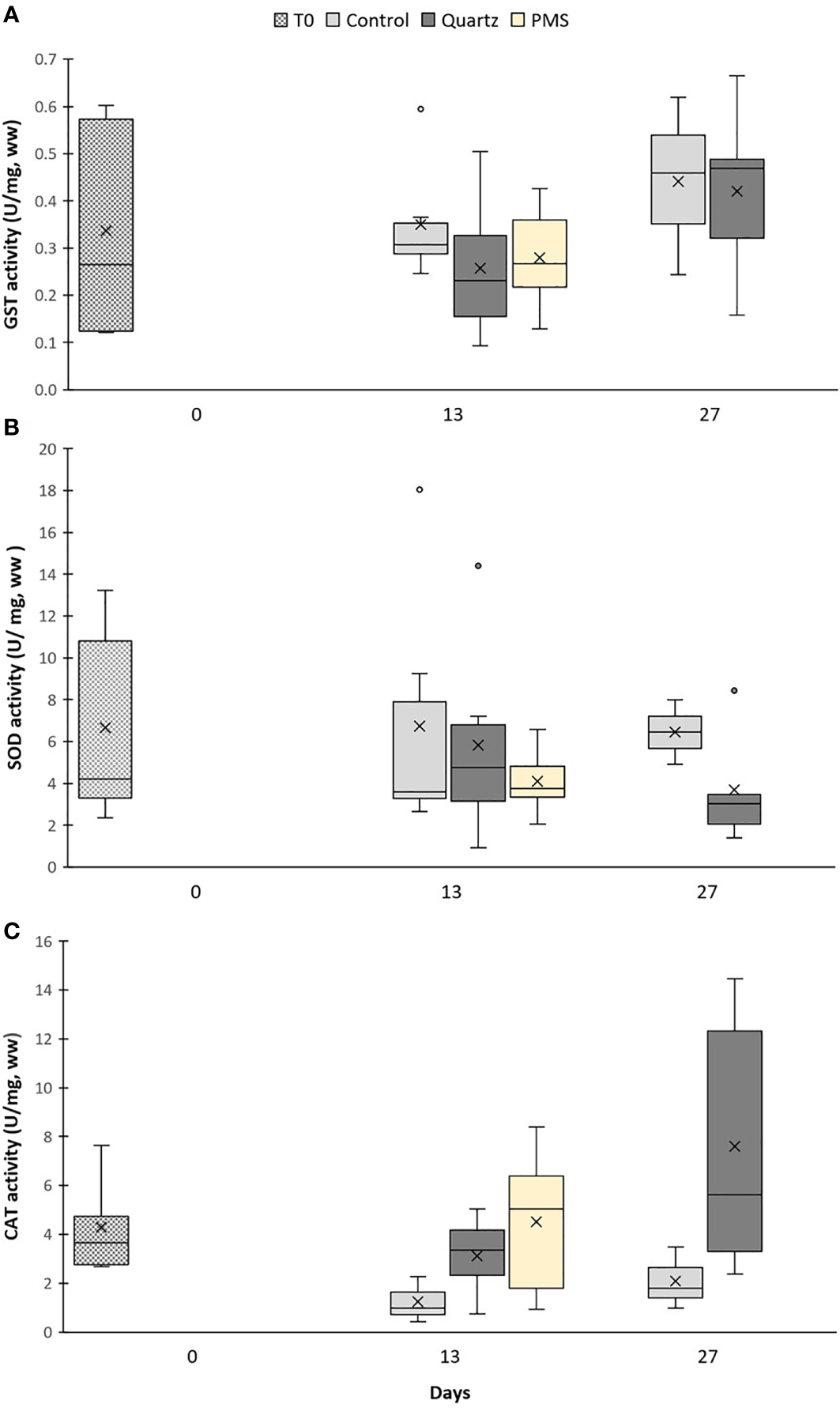 Enzyme activities of (A) Glutathione S−transferase (GST), (B) superoxide dismutase (SOD) and (C) catalase (CAT) in Dentomuricea aff. meteor tissues during the experiment (times 0, 13, 27) in treatments with polymetallic particles (PMS), with quartz particles (Quartz) and in the control treatments with no sediment addition. N=3-6, no fragments in the PMS treatment at T27. The line in the box is the median, and the X is the mean. Whiskers represent the highest and lowest values and outliers are identified by a circle (○).