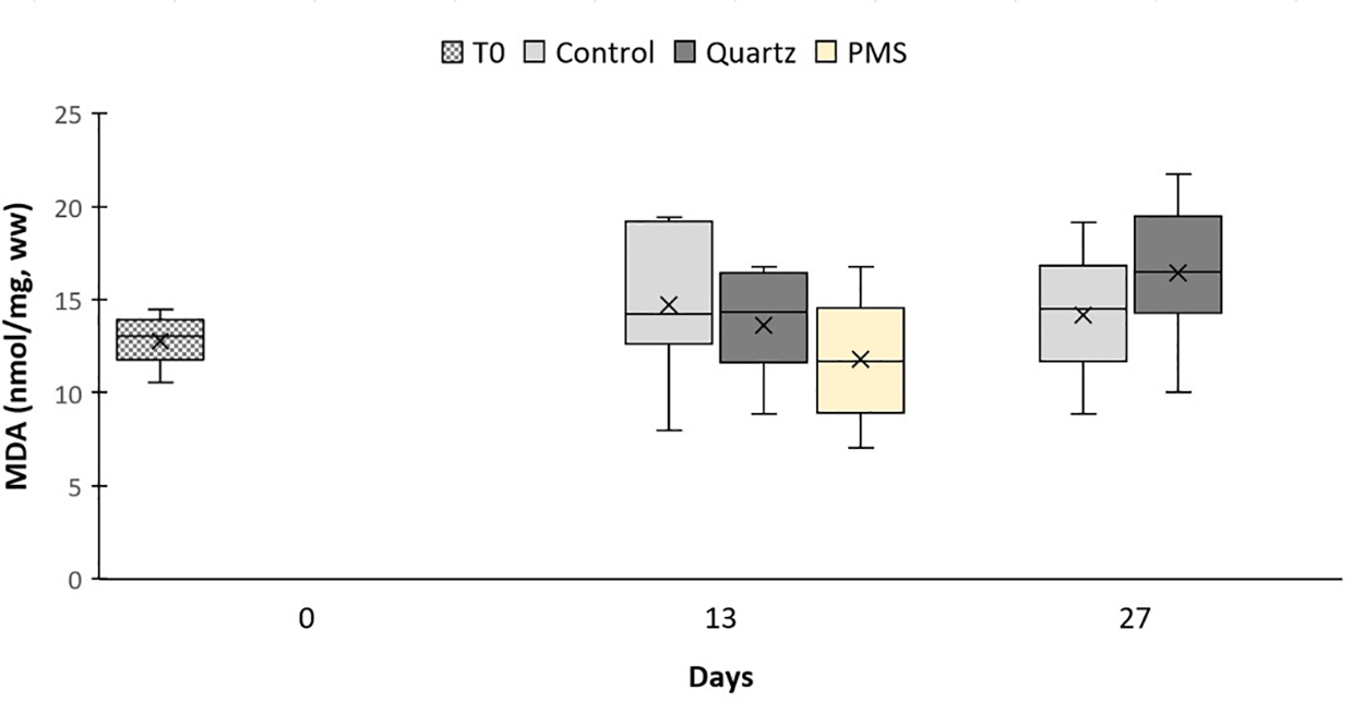 Concentrations of malondialdehyde (MDA) in Dentomuricea aff. meteor tissues during the experiment (times 0, 13, 27) in treatments with polymetallic particles (PMS), with quartz particles (Quartz) and in the control treatments with no sediment addition. N=3-6, no fragments in the PMS treatment at T27. The line in the box is the median, and the X is the mean. Whiskers represent the highest and lowest values and outliers are identified by a circle (○).