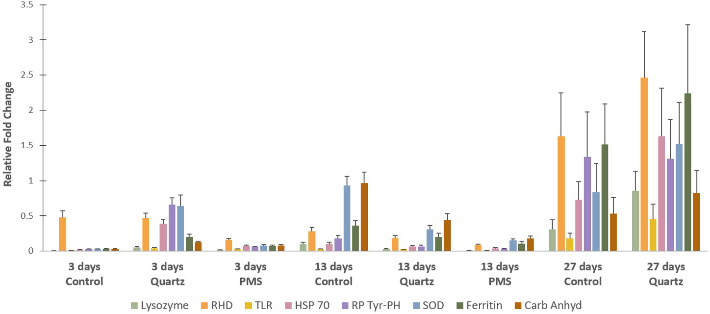 Relative gene expression of selected genes for the Dentomuricea aff. meteor during the experiment (times 3, 13, 27) in treatments with polymetallic particles (PMS), with quartz particles (Quartz) and in the control treatments with no sediment addition. Values are means of the relative gene expression normalized with the expression of two reference genes - 18S and β-actin - and relative to expression levels in T0, just prior to the start of the experiment. Expression levels (fold change) for the different target genes, Lysozyme, RHD (Rel Homology Domain), TLR (Toll-like receptor), HSP70 (heat shock protein 70), RP Tyr-PH (receptor-type protein tyrosine phosphatase), SOD (Superoxide Dismutase), Ferritin and Carb Anhy (alpha-carbonic anhydrase) are represented in different colour bars. Data expressed as mean ± standard error. Three technical replicates and n=6 for all treatments at times T3 and T13 days, n=2 for control treatment at T27, no fragments in the PMS treatment at T27.
