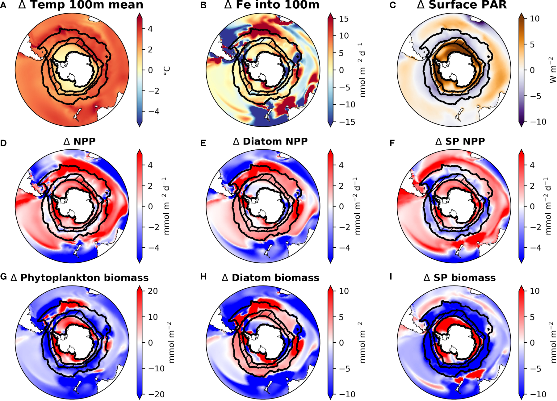 CESM-simulated changes in photosynthetically active radiation (PAR) arriving at the ocean surface are most dramatic in the SIZ (Figure 1C), where climatic warming leads to ~50% loss of sea ice around Antarctica. This sea ice decline results in an annual mean surface PAR increase of 8.5 W m-2 in the SIZ (Table 2), a nearly 50% increase (Figure 2B). CESM also simulates a slight decrease in surface PAR in the ACC (Figures 1C, 2A) by 2.2 W m-2 (-4.5%; Table 2). Here decreases in light are caused by increased cloudiness in this region as westerlies shift southward (Figure S5E). These changes in light along with the changes in iron supply, as described above, lead to interesting rearrangements of the phytoplankton communities in the light- and iron-limited Southern Ocean.