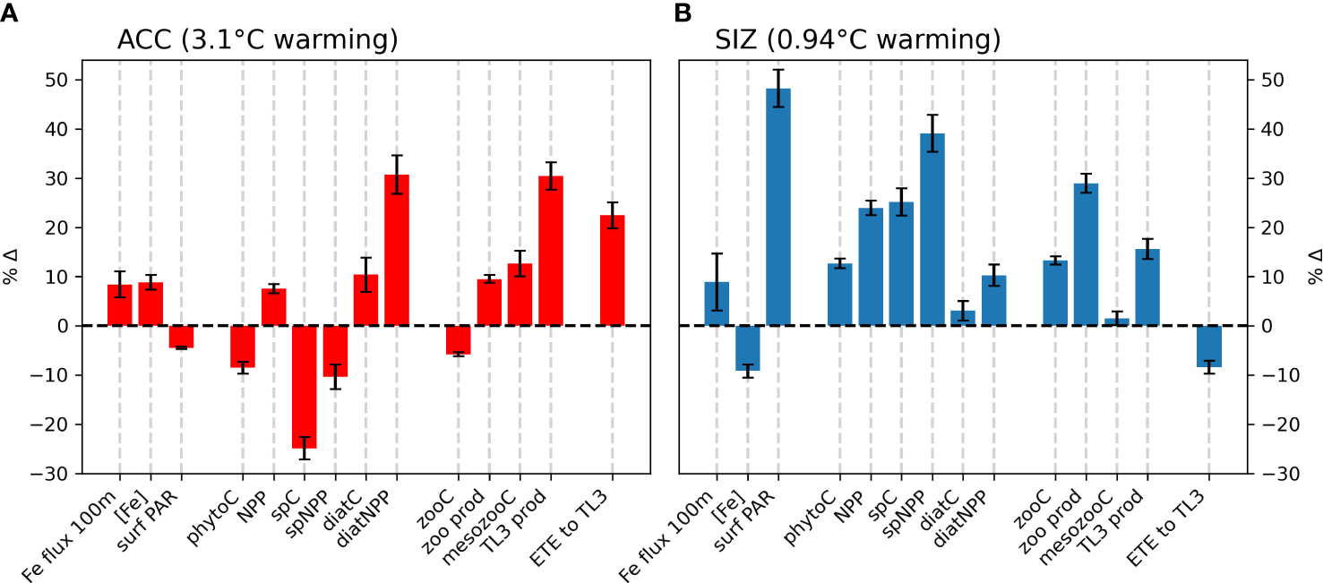 Percent changes in environmental drivers and biological responses that accompany climatic warming from the 1920s to the 2090s (CESM1-LE ensemble mean), in the (A) Antarctic Circumpolar Current (ACC) and (B) the sea ice zone (SIZ) regions of the Southern Ocean. Environmental drivers include depth-integrated horizontal and vertical fluxes over the top 100m (Fe flux 100m), top 100m mean iron concentration ([Fe]), and photosynthetically active radiation at the surface (surf PAR). Biomass terms include total phytoplankton biomass (phytoC), as well as small phytoplankton biomass (spC), diatom biomass (diatC), total zooplankton biomass (zooC), and mesozooplankton biomass (mesozooC). Production terms include total net primary production (NPP), small phytoplankton NPP (spNPP), diatom NPP (diatNPP), zooplankton production (zoo prod), and trophic level 3 production (TL3 prod). Ecosystem transfer efficiency to trophic level 3 is abbreviated “ETE to TL3”. All biomass and production terms are integrated over the top 100m. Error bars represent one standard deviation among ensemble members in the CESM1-LE, and thus show the influence of internal climate variability.