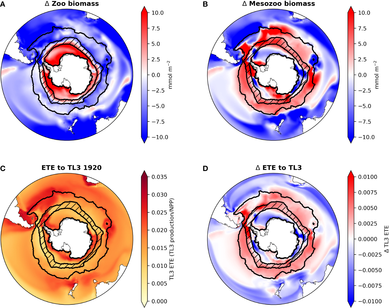 The Southern Ocean environment is changing rapidly under the influence of anthropogenic climate warming, with implications for the marine ecosystem (Morley et al., 2020). Southern Ocean primary productivity and phytoplankton community composition, for example, play an important role in regulating global ocean productivity and carbon cycling (Sarmiento et al., 2004; Krumhardt et al., 2020; Nissen et al., 2021)—and influence how carbon and energy are transferred up local food chains. Primary productivity in the Southern Ocean ultimately supports higher trophic level organisms such as fish, seabirds, seals, and whales. Climate-driven changes in primary productivity, as well as shifts in plankton community composition, may yield cascading effects on the broader marine ecosystem (Deppeler and Davidson, 2017). Indeed, shifts in Antarctic phytoplankton communities are already being observed (Mendes et al., 2018; Lima et al., 2019; Henley et al., 2020). In this paper, we examine simulations conducted with an Earth system model (ESM) run under a high emission scenario as a means of investigating possible bottom-up drivers of change in the Southern Ocean marine ecosystem and potential effects on higher trophic levels.