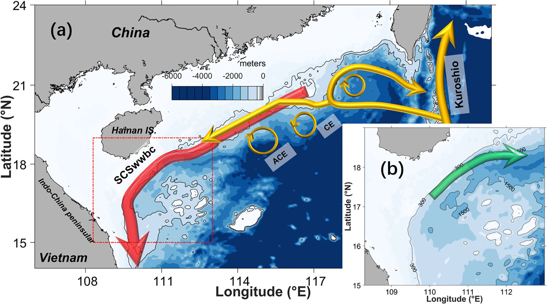 Below the upper layer, several model studies have suggested that large scale circulation in the intermediate layer is generally anticyclonic (Yuan, 2002; Gan et al., 2016; Wei et al., 2016; Cai and Gan, 2020), which implies that, in contrast to the upper layer, current over the western slope of the SCS may flow northward beneath the SCSwwbc, though no observational evidence is available yet over the continental slopes of the northwestern SCS and that further south. Hence, our understanding of the slope current beneath the upper layer is still very limited.