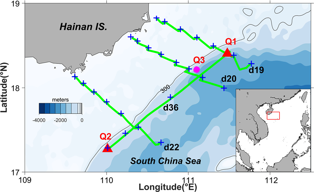 | Q3 | 1100 | (111.101,18.212) | Downward 75 K ADCP | 16 | 24-552 | 2018/11/30-2018/12/3 |