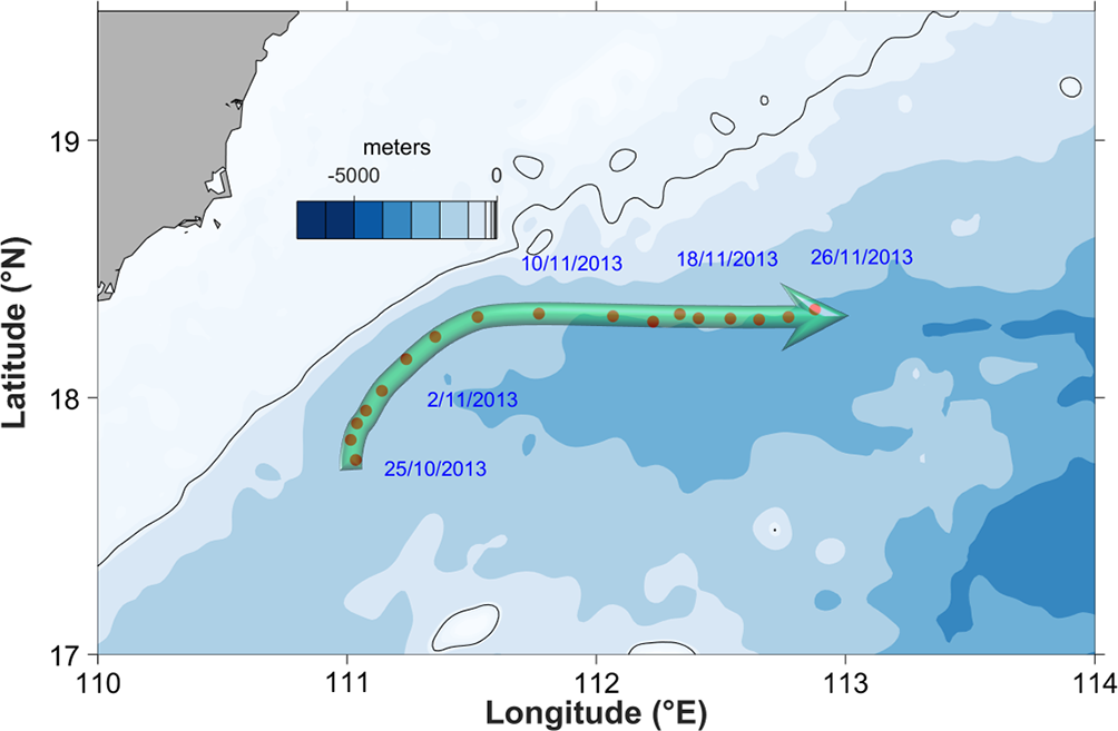 The trajectory of an ARGO buoy (No-2901436) was also used, which transits the slope region of the northwestern SCS from 25 October to 26 November 2013. Because it will suspend in nearly 800 m depth when it was in standby mode, the circulation characteristics of the deep layers can be determined by its moving direction.