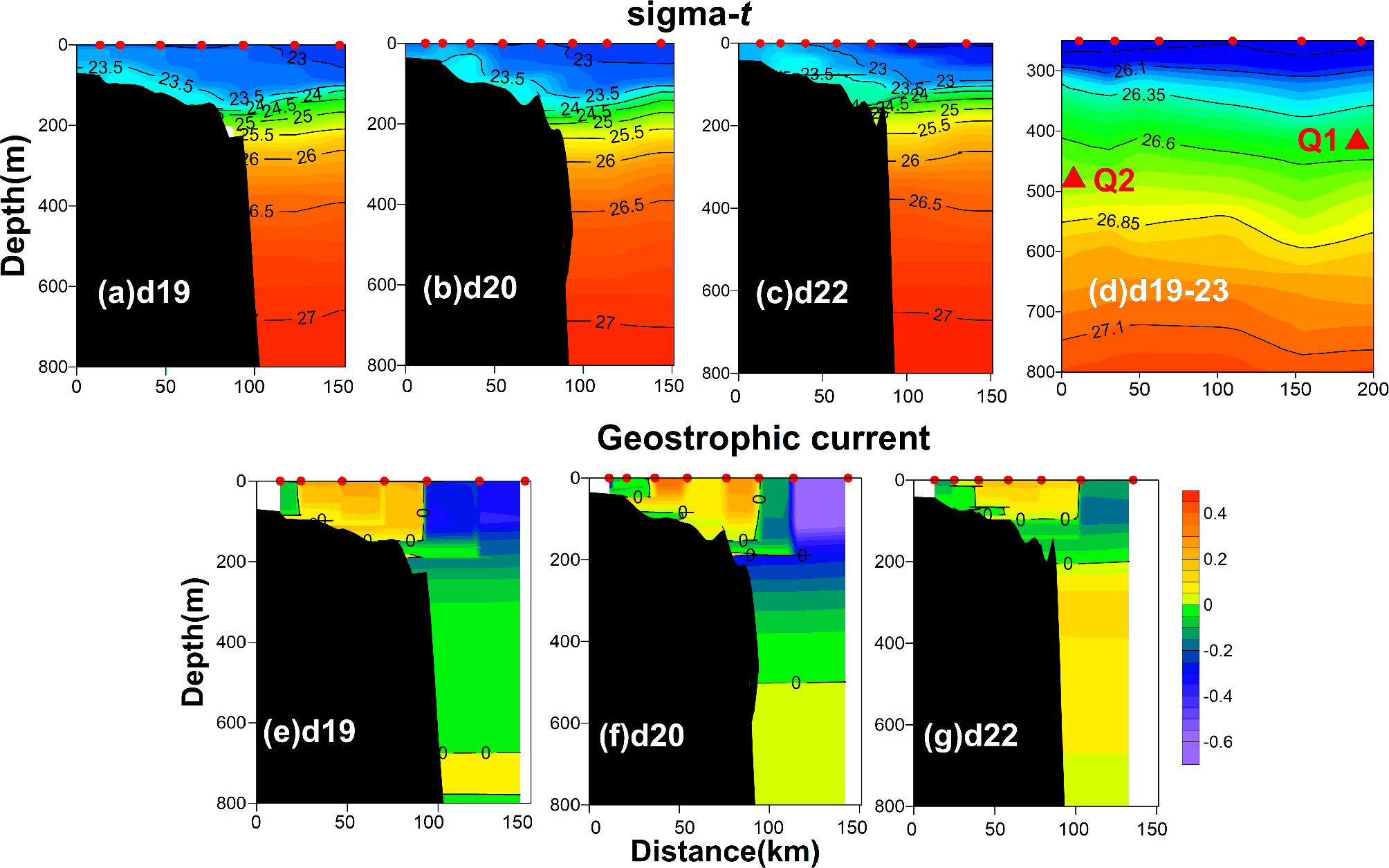 Distribution of the potential density sigma-t (kg m-3) (A–C) and geostrophic current (m s-1) (E–G) on cross-slope transects d19, d20, and d22; sigma-t along-slope transect d19-23 (only at depths from 200 to 800 m) (D). Note that the geostrophic current is referred to 1000 dbar; the along-slope transect is close to mooring stations Q1 and Q2 (red triangles). The accompanying CTD castings (red dots) at the stations were performed on days 19, 20, 22 and 19–23.