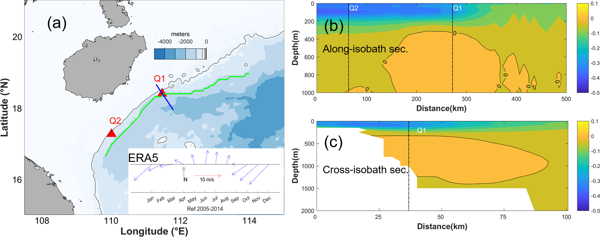(A) Transects for the flow field from the HYCOM output along the 1000-m isobath (green curve) and cross-isobath (blue curve); the inset at the lower right is the stick diagram of monthly mean wind velocity averaged over ten years (2005-2014) in the study region. Mean along-slope current (m/s) from HYCOM output along the 1000-m isobath (B) and cross-isobath (C) in the months (from October to March) of winter monsoon for the years from 2005 to 2014. The black contours in panels B and C indicate zero flow speed; the along-isobath (off-isobath) distances of mooring stations Q1 and Q2 are indicated with black dotted lines.