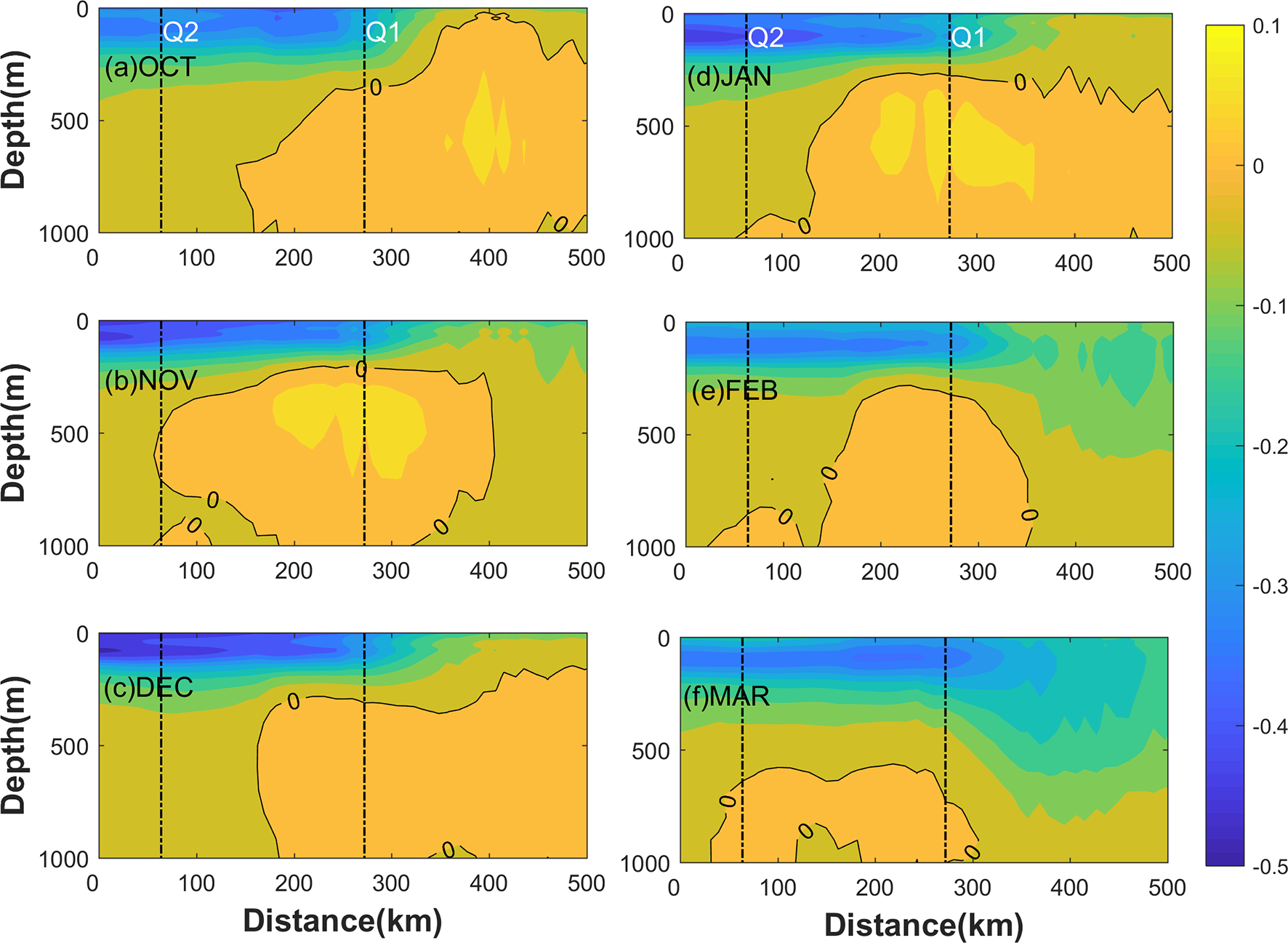 The 10-yr mean along-slope current (m/s) from HYCOM output along the 1000-m isobath in the months of winter monsoon: Oct. (A), Nov. (B), Dec. (C), Jan. (D), Feb. (E) and Mar. (F). The black contours indicate zero flow speed. The along-isobath distances of mooring stations Q1 and Q2 are indicated with black dotted lines.