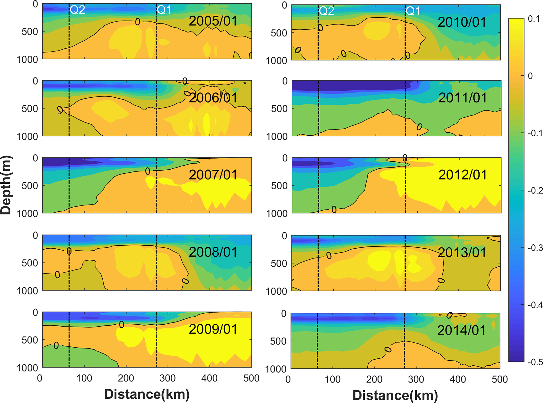 Mean along-slope current (m/s) from HYCOM output along the 1000-m isobath in January for the years from 2005 to 2014. The black contours indicate zero flow speed. The along-isobath distances of mooring stations Q1 and Q2 are indicated with black dotted lines.