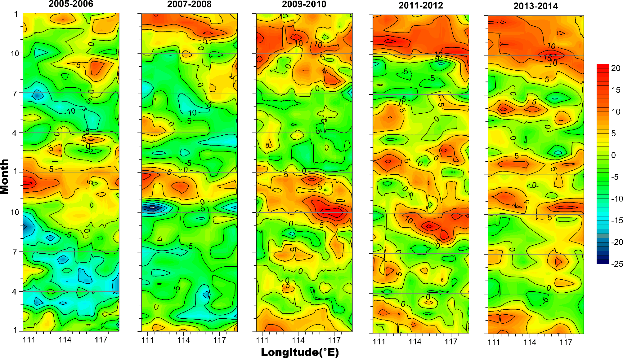 The time/longitude distribution of the mean sea level anomaly (unit in cm, averaged within 0.3 latitude beyond 300 m isobath) on the slope of the northern SCS in the years from 2005 to 2014, derived from satellite along-track data.