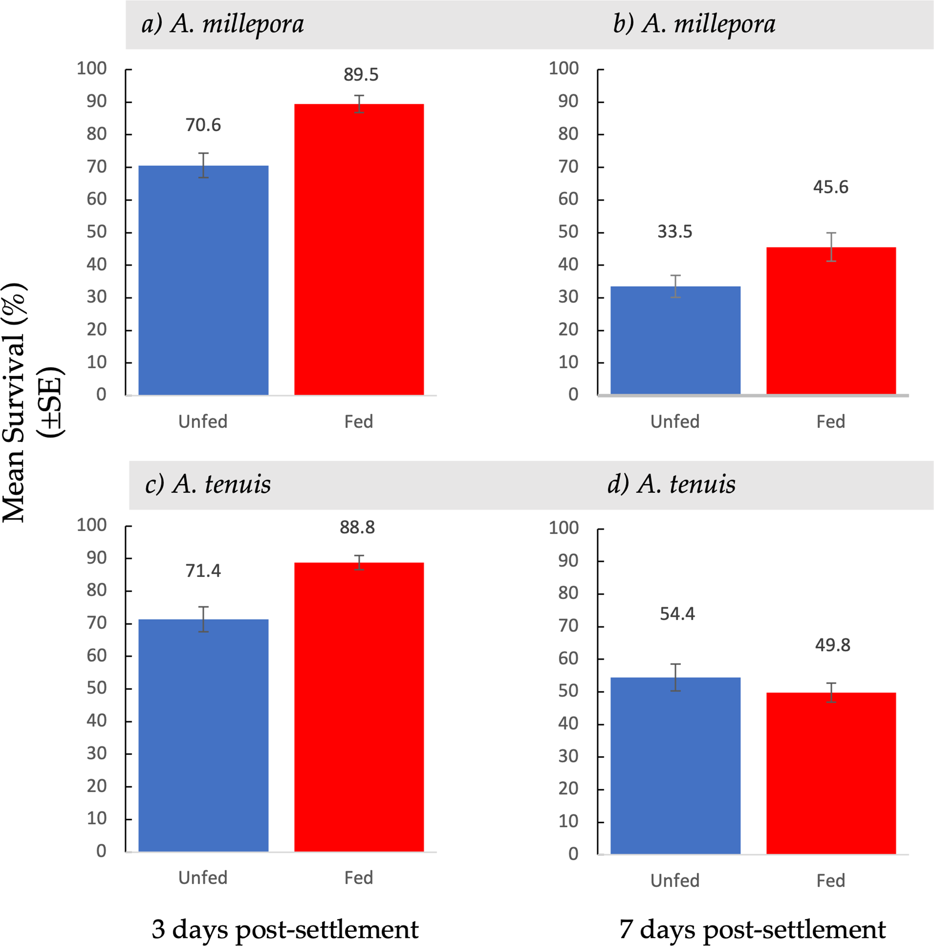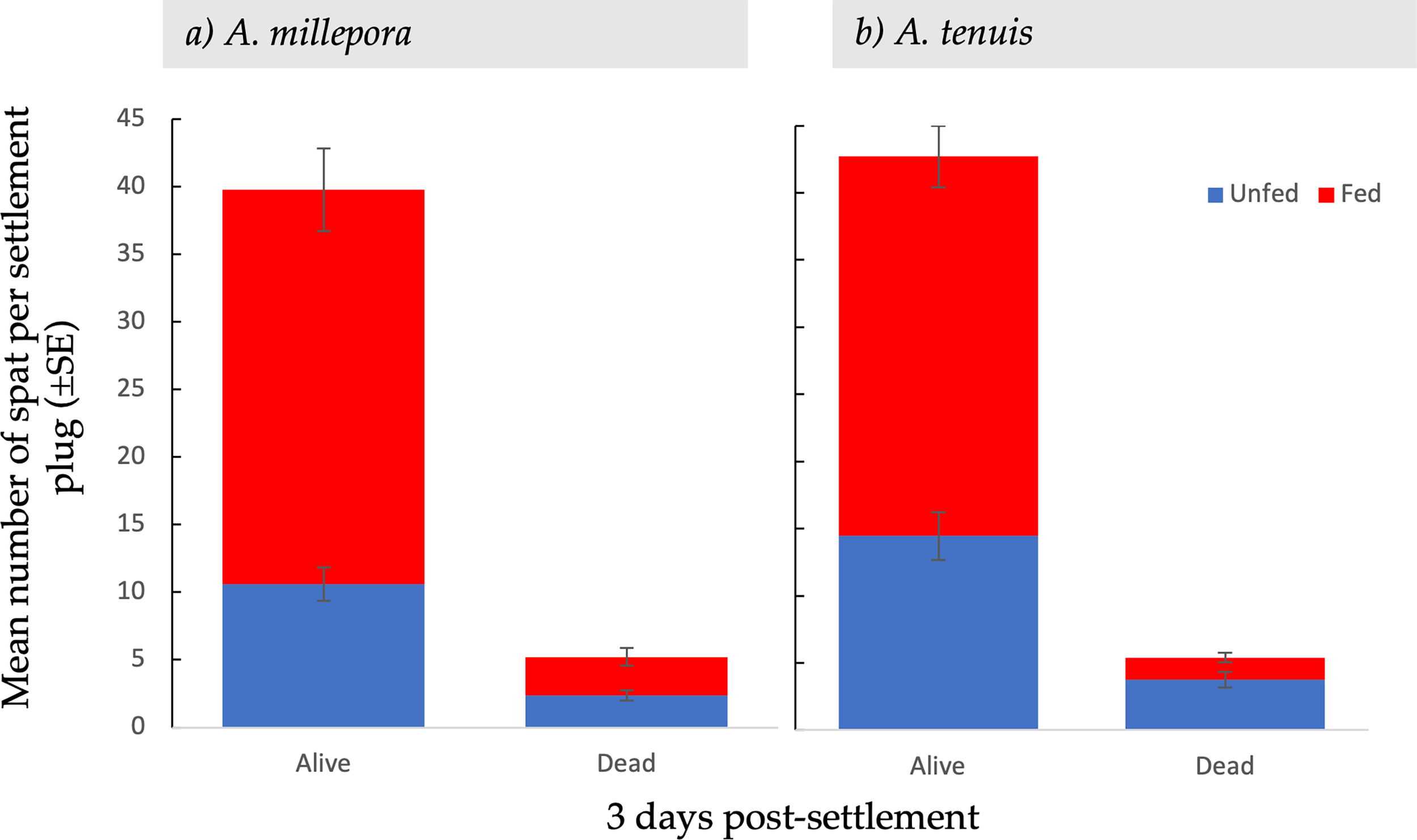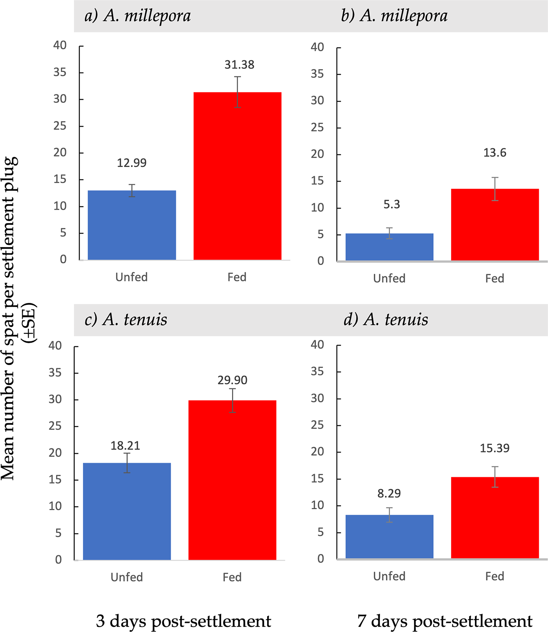 Overcoming high post-settlement mortality bottlenecks is a high priorityIn A. millepora larvae, the trend of higher settlement in fed treatments was maintained when all spat were counted. The average number of settled larvae, including those on unconditioned surfaces in the unfed treatment, was more than half that of the fed larvae (436.3 ± 74.53 SE vs 1000.5 ± 34.50 SE, respectively, t(2) = 5.37 p = 0.017). Of the total number of A. millepora spat across all fed treatments, 78.4% settled on conditioned settlement surfaces (1569 vs 432 spat). Meanwhile, A. millepora larvae across all unfed treatments settled on an unconditioned settlement surface 74.4% of the time (1299 vs 446 spat). The mean total spat per settlement tray was significantly higher in A. millepora larvae (p = 0.016). Similarly, the mean totalsettlement per settlement tray in A. tenuis larvae was twice as high in the fed treatments (1146.2 ± 279.00 SE) than those in the unfed treatments (619.3 ± 244.06 SE). However, the difference in the mean total settlement per settlement tray was not statistically significant between the fed and unfed treatments (t(6) = 1.42, p = 0.21). As with the A. millepora larvae, A. tenuis larvae from fed treatments settled on conditioned settlement surfaces 65.2% of the time (3737 vs 1994 spat) while 73.5% of larvae from unfed treatments settled on conditioned settlement surfaces (1366 vs 492).
