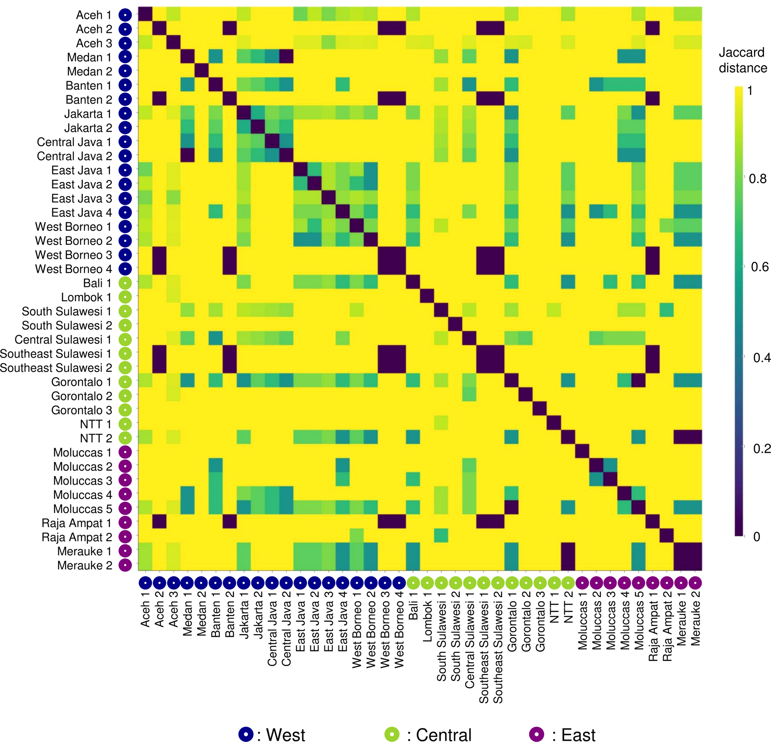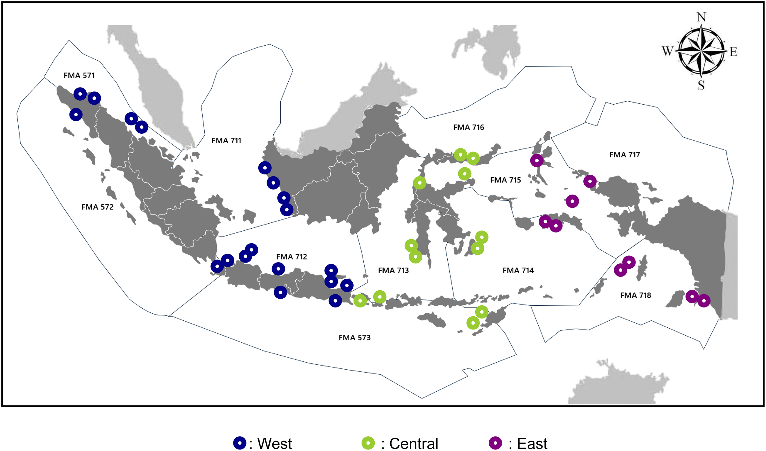 eDNA seawater sampling sites in coral reefs across Indonesia by region (West n = 19, Central n = 12 and East n = 9) and fisheries management area (FMA).