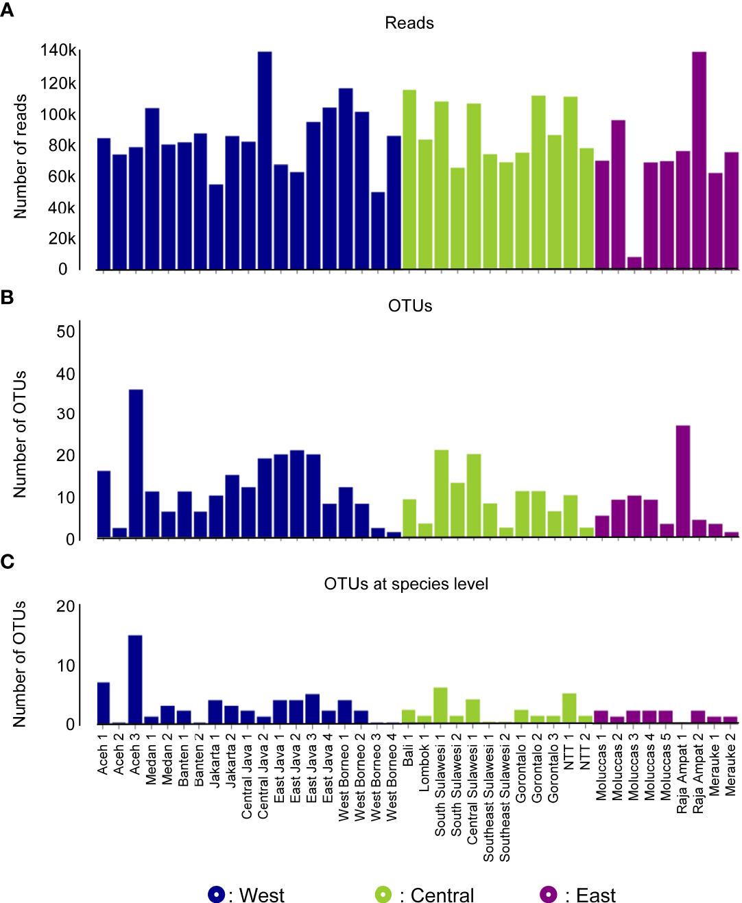 eDNA sequence data obtained by sampling site and region: number of reads (A), number of Operational Taxonomic Units (OTUs) (B), and OTUs identified to species level (C).