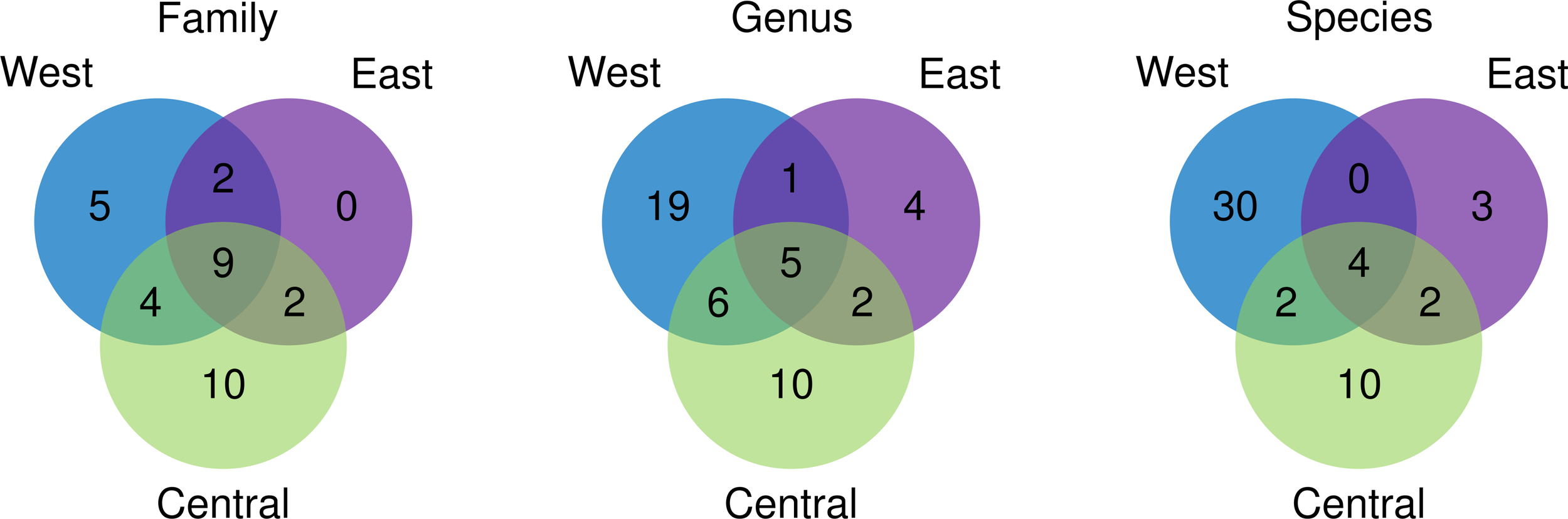 Venn diagram showing the taxonomic overlap of decapods identified from sites in West, Central, and East Indonesian regions at Family, Genus, and Species levels.