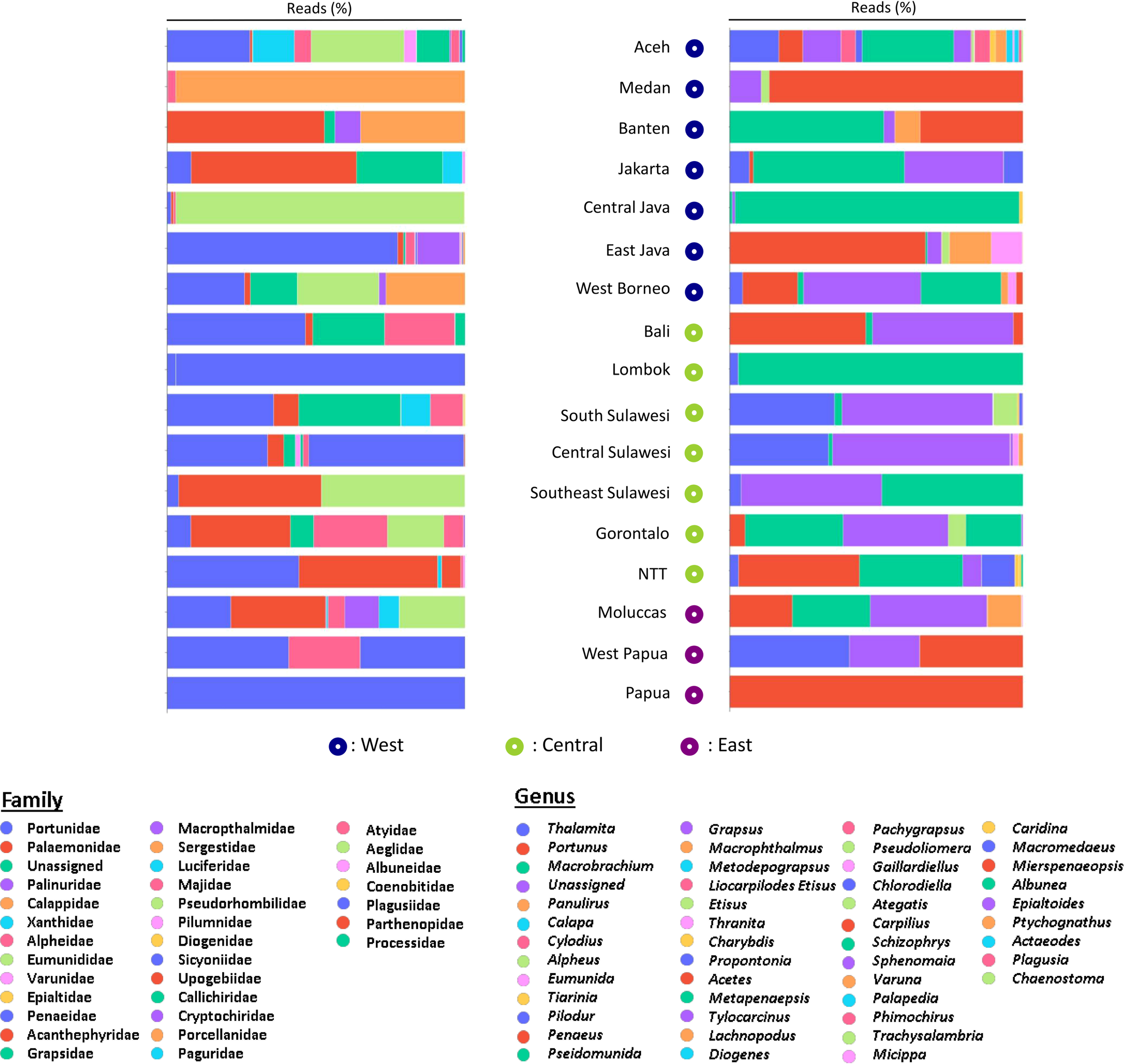 Madduppa H, Sani LMI, Nugroho KC, Bengen DG, Muchlisin ZA, Fadli N, Subhan B, Arafat D, Zamani NP, Sunuddin A, Ismet MS, Srimariana ES, Cakasana N, Lestari DF, Santoso P, Setyaningsih WA, Baksir A, Manurung VR, Damora A, Ramadhaniaty M, Sartimbul A, Oli MYUP, Tanod WA, Munira, Dobo J, Setyobudi E, Nadiarti N, Jompa J, Auliyah N, Ndobe S, Mahyudi I, Ninef JSR, Rehatta BM and Moore AM (2022) eDNA metabarcoding of decapod crustaceans across Indonesian seas has implications for biodiversity conservation and fisheries sustainability. Front. Mar. Sci. 9:918295. doi: 10.3389/fmars.2022.918295
