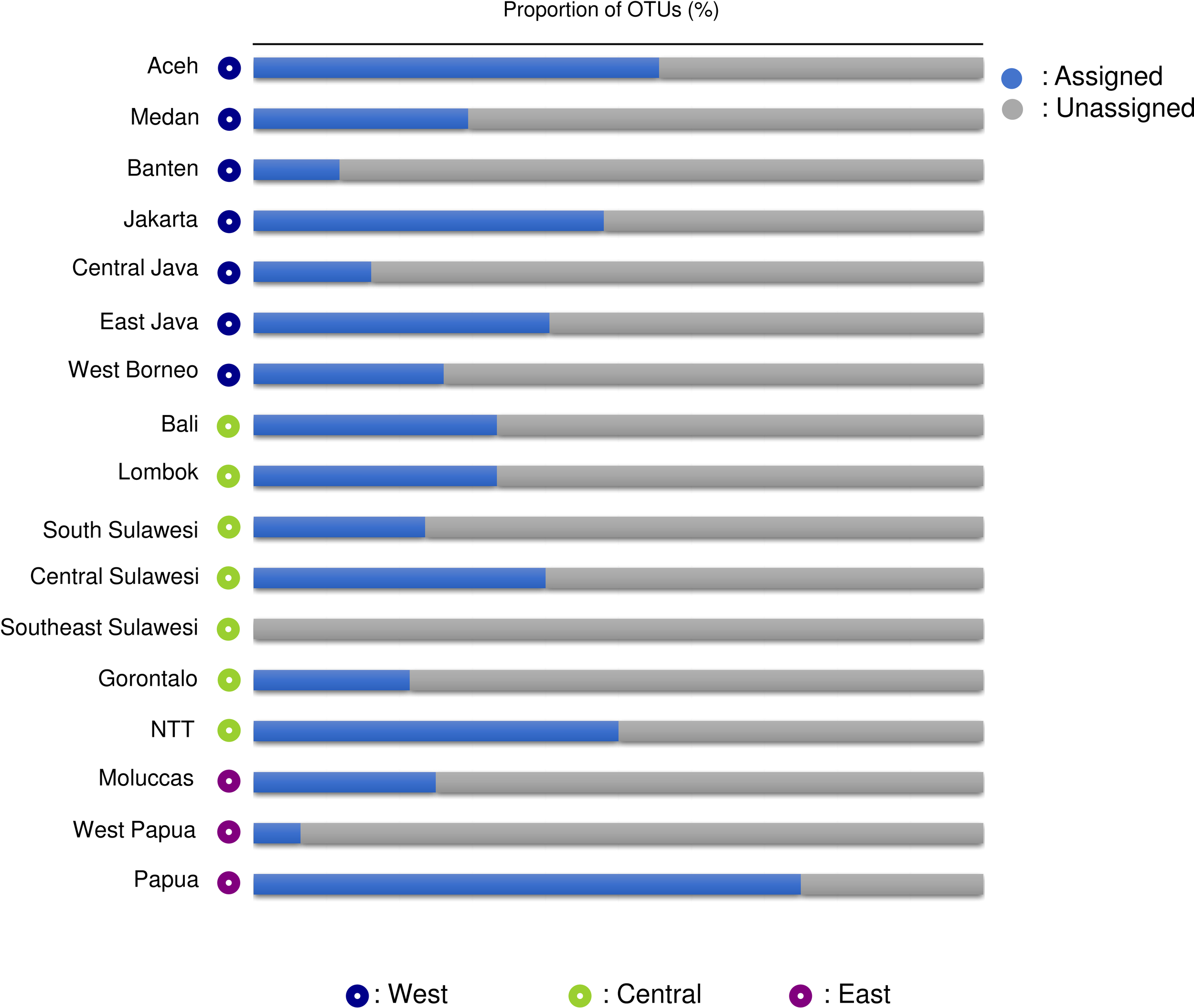 A total of 3,401,773 paired-end reads were generated from the 16S rRNA amplicons obtained from the 40 samples collected from 40 coral reef sampling sites across Indonesia. The species accumulation curve (SAC) shows a linear increase in species richness between stations (Supplementary Figure 2). mBRAVE analysis yielded 406 OTUs across all sampling locations based on a 3% similarity threshold (Figure 2). Taxonomic assignment identified 51 species belonging to 47 genera and 32 families (Figure 3 and Table 1). Based on region, the highest number of families (25) was identified from the Central Indonesia region, while the highest number of genera (31) and species (36) were identified in the West Indonesian region. The East Indonesia region had the lowest taxonomic richness based on the families, genera, and species identified in this study. Figure 4 shows the decapod community composition by family and genus (based on read abundance) varied between sampling sites (aggregated by province). The Portunidae family contributed the highest percentage of read abundance at all sites, followed by Palaemonidae and the unassigned OTUs. At the genus level, Thalamita, Portunus, and Macrobrachium contributed the highest read abundance percentage, while a large proportion of OTUs were unassigned at the genus level, ranking fourth highest in terms of relative abundance. A comparison between the percentage of assigned and unassigned OTUs for all sampling sites in each province and region is shown in Figure 5. Overall, a high percentage of OTUs was unassigned to species level at all sites. The lowest percentages of unidentified OTUs were from the easternmost and westernmost sites, with very high unassigned OTU percentages at some sites in all three regions. The site with the highest percentage of unassigned OTUs was the Wakatobi, Southeast Sulawesi (Central region), followed by Raja Ampat (East region), and Banten (West region).