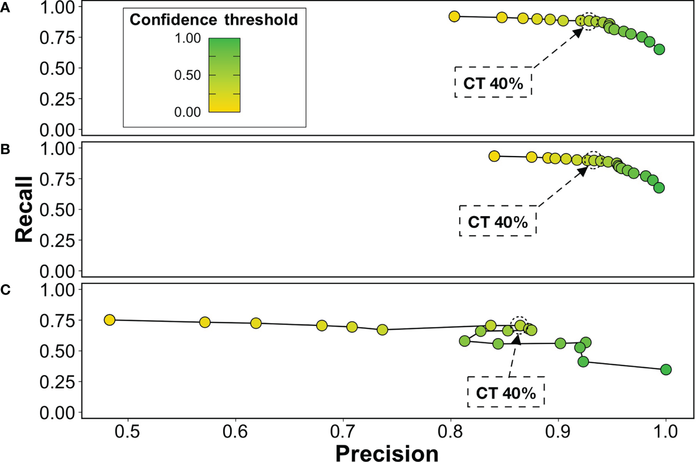 Precision and recall values for count per frame results for (A) overall model, (B) luderick and (C) bream, shown for Detectron as example. Confidence intervals are in 5% increments; a confidence threshold of 40% is highlighted as resulting in the best F1 score, for performance as reported in Table 2.
