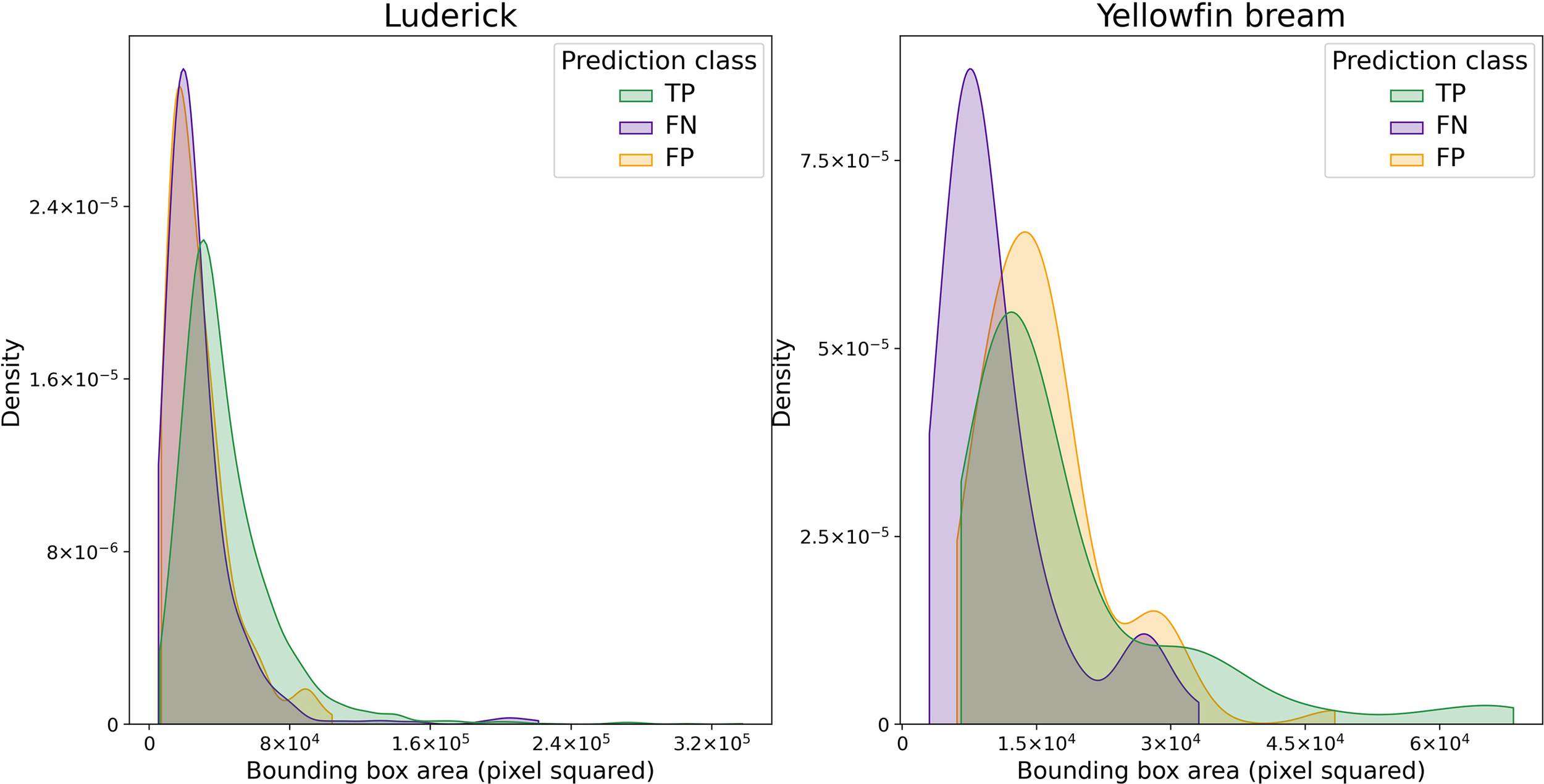 Distribution of fish relative sizes (bounding box areas in pixels) for three classes of predictions (True Positives, False Negatives, False Positives), for luderick and bream. No substantial differences among classes are evident for luderick but for bream image size tends to be smaller for FNs). Results are for one of the three models using the Detectron framework, other model results were very similar.