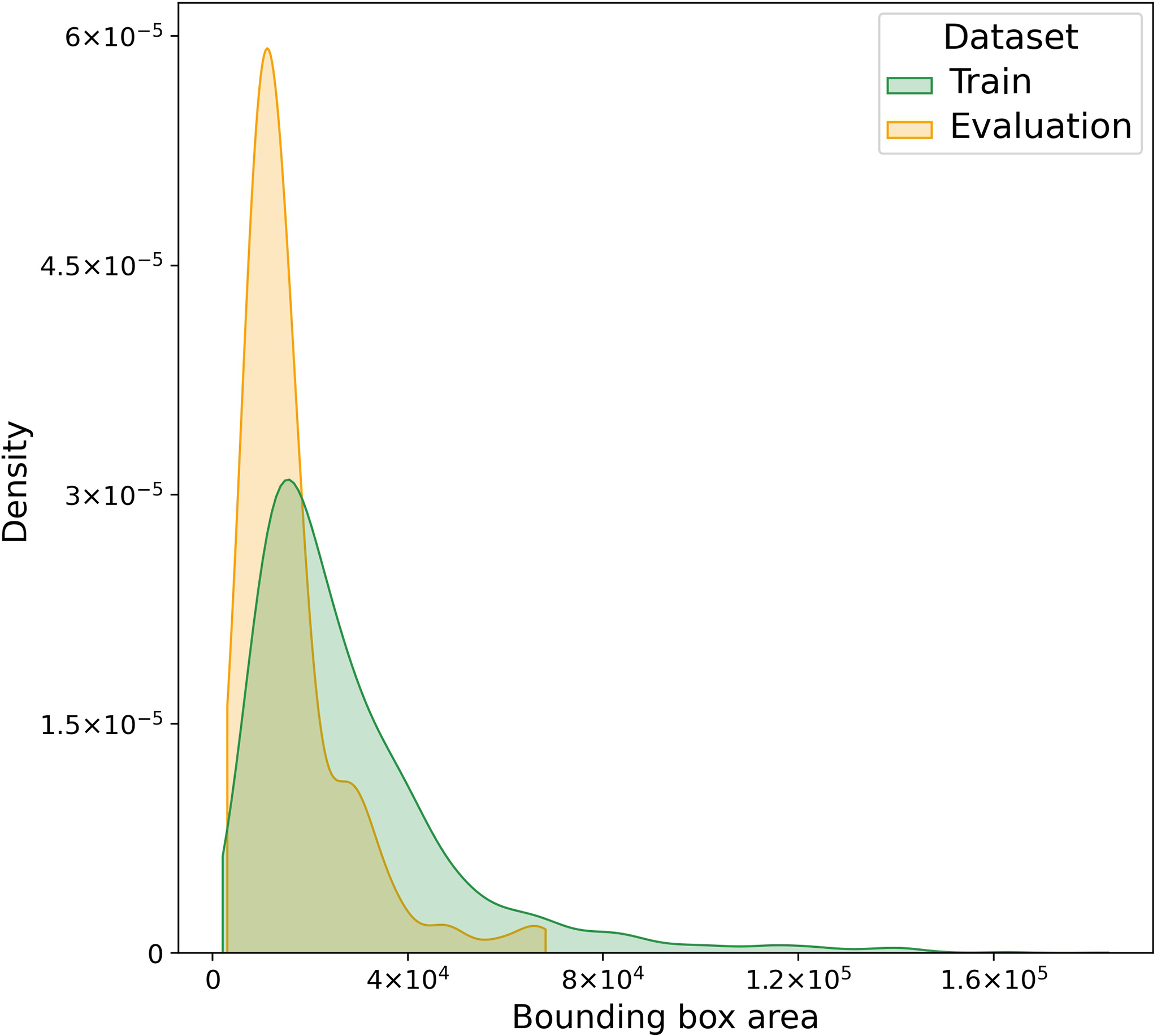 Distribution of relative fish sizes (bounding box areas in pixels) in the training and evaluation datasets for bream. Size distributions were similar, although with slightly fewer small images used in training.