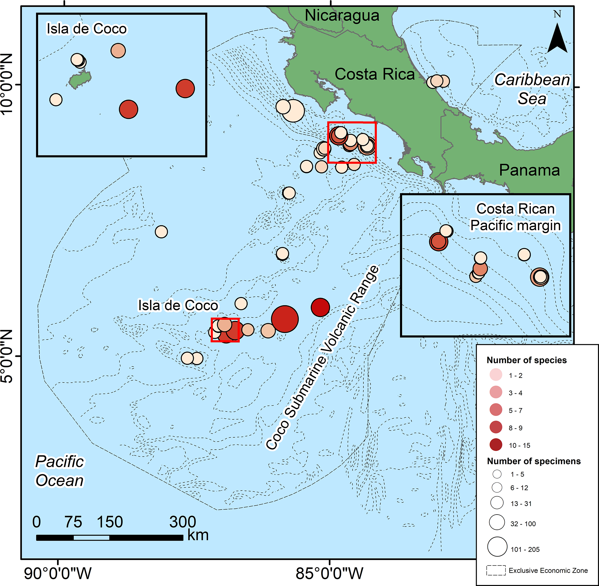 The Costa Rican Pacific area is much larger than the Caribbean, covering 544,813 km2, hosting a greater variety of deep-sea environments (Cortés, 2016a; Cortés, 2016b). There are mesophotic ecosystems (Cortés, 2019), methane seeps (Sahling et al., 2008; Levin et al., 2012; Levin et al., 2015), seamounts (Auscavitch, 2020), deep areas of fluid discharge (Wheat et al., 2019), extensive abyssal plains (Agassiz, 1898; Townsend, 1901) and a large deep pelagic region. The extensive Coco Submarine Volcanic Range (CSVR, also called Cocos Ridge) has been explored too (Neuhaus, 2004; Alvarado-Induni, 2021).