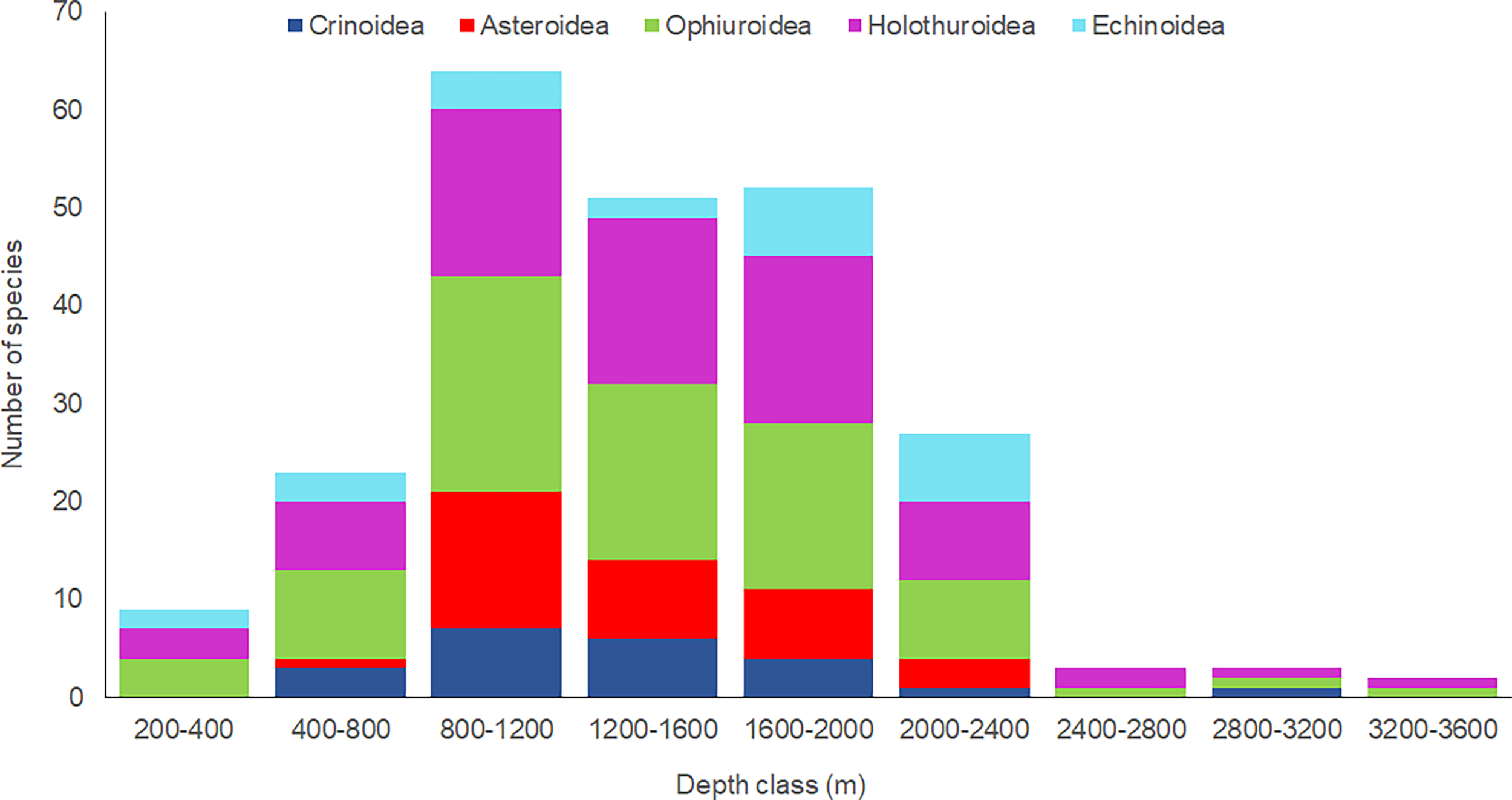 The greatest number of taxa by depth range (Figure 2) was found between 800 and 1200 m with 64 taxa, followed by 52 and 51 taxa between 1600-2000 m and 1200-1600 m, respectively. The holothuroid Benthodytes sanguinolenta and the ophiuroid Ophiosphalma glabrum were the species with the largest bathymetric distribution range (385-3453 m and 1157-3400 m, respectively), and the only two species found deeper than 3200 m. One species of ophiuroid, Ophiacantha similis, had a shallower deep range than previously reported, while the holothuroids, Psolus aff. diomedeae, Benthodytes sanguinolenta, Oloughlinius macdonaldi, and the echinoid, Clypeaster euclastus, had deeper depth ranges than previously reported (Table 1).