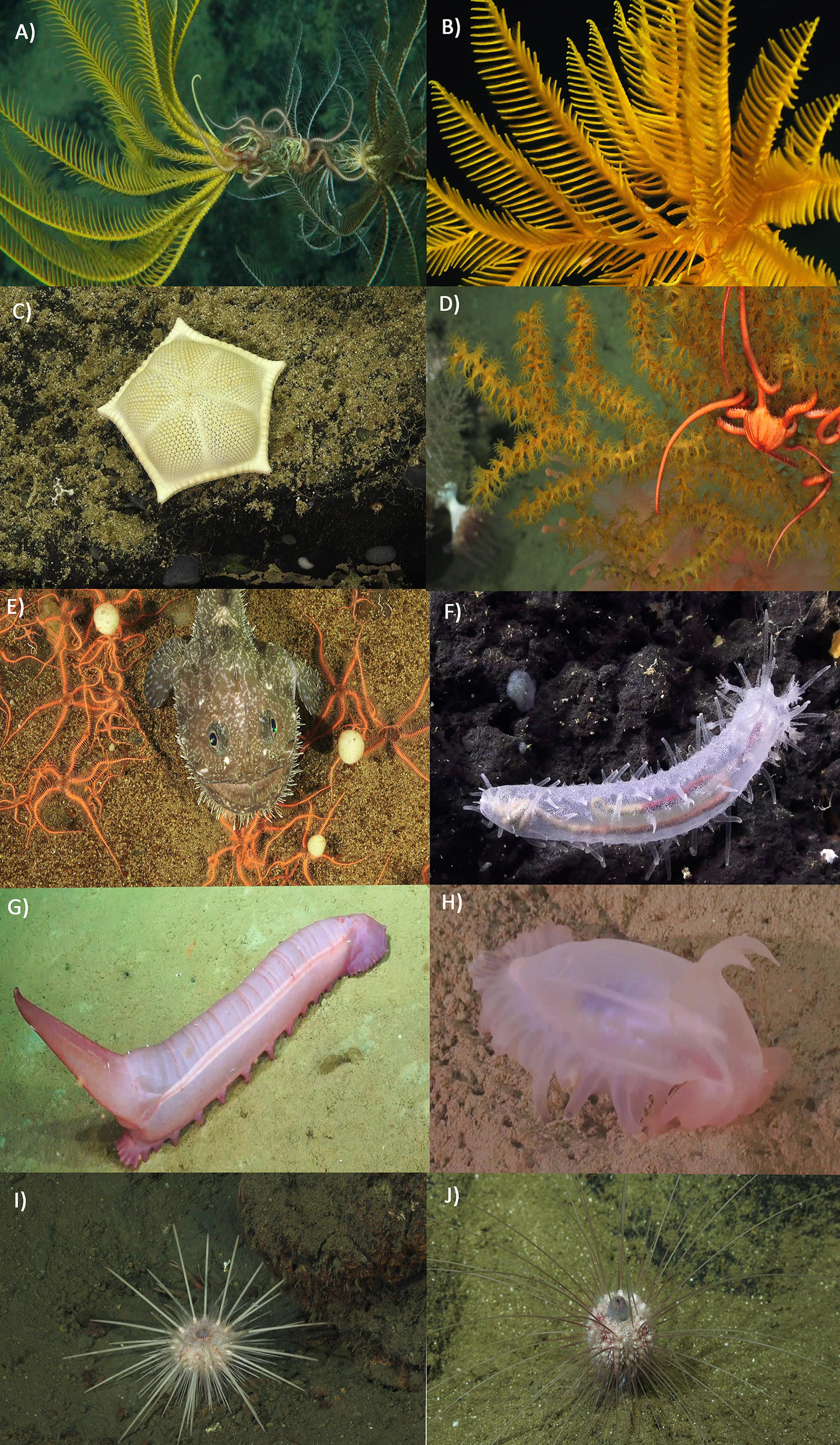 Figure 5 Costa Rican deep-sea echinoderms. (A) Antedonidae sp.; (B) Antedonidae sp.; (C) Ceramaster sp.; (D) Asteroschema sp.; (E) Ophiacantha sp. and the fish Lophiodes caulinaris (Lophiidae); (F) Synallactida sp.; (G) Psychropotidae sp.; (H) Peniagone sp.; (I) Caenopedina sp.; (J) Aspidodiadema sp. Images were taken by the HOV Alvin and ROV SuBastian onboard of the Costa Rica expeditions.