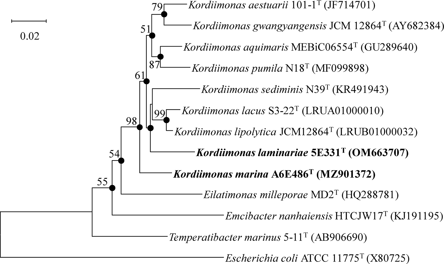 Neighbor-joining phylogenetic tree based on 16S rRNA gene sequences of strains A6E486T and 5E331T and other closely related species. Filled circles indicate branches that were recovered with all three methods (neighbor-joining, maximum-likelihood, and maximum-parsimony). Percentage bootstrap values above 50% (1,000 replicates) are shown at branch nodes. Escherichia coli ATCC 11775T was used as the out-group. Bar, 0.02 substitutions per nucleotide position.