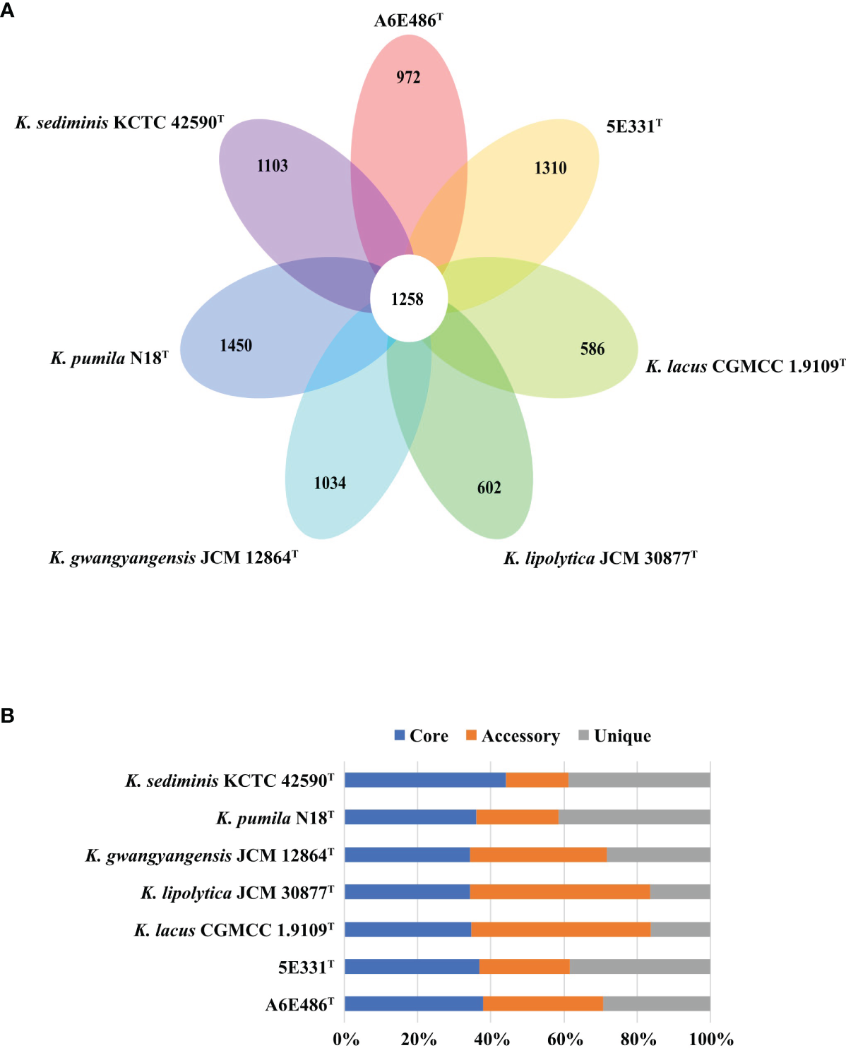 Genomic DNA of strains A6E486T and 5E331T was extracted using a bacteria genomic DNA kit (Takara), and the draft genomes were determined by Beijing Novogene Bioinformatics Technology Co. Ltd. (Beijing, China). Sequencing was performed on the Illumina NovaSeq 6000 platform (Illumina Inc., San Diego, CA, USA) using the paired-end 150-bp sequencing protocol. Raw sequencing data were generated by Illumina base-calling software CASAVA v1.8.24, and the sequenced reads were assembled using SOAPdenovo software (Li et al., 2009). Other relevant genomes in this study were obtained from the NCBI Prokaryotic reference genome database.