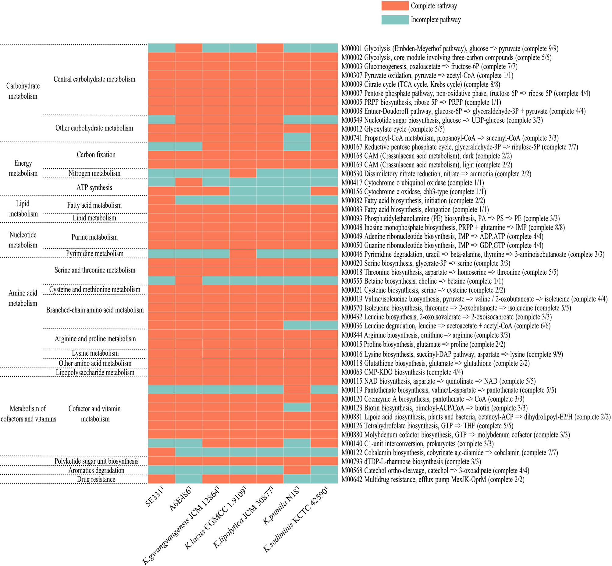 Morphological observations by transmission electron microscopy and scanning electron microscopy showed that cells of strains A6E486T (with widths of 0.5–0.7 μm and lengths of 1.0–2.5 μm) and 5E331T (with widths of 0.2–0.5 μm and lengths of 0.8–2.7 μm) were both short rod-shaped (Supplementary Figure S1). For strain A6E486T, the oxidations of the sole carbon source were positive for d-maltose, d-trehalose, d-fructose, glycyl-l-proline, l-glutamic acid, l-galactonic acid lactone, and d-glucuronic acid, which was consistent with K. gwangyangensis JCM 12864T, while that of strain 5E331T was negative as K. lipolytica JCM 30877T (Supplementary Table S1). Strains A6E486T and 5E331T exhibited some similarities to K. gwangyangensis and K. lipolytica JCM 30877T, including their abilities to hydrolyze Tweens (20, 40, and 60). The differential characteristics of strains A6E486T and 5E331T and experiment control strains were summarized in Table 1 and Supplementary Table S1. Both strains A6E486T and 5E331T were susceptible to (μg per disc) penicillin (10), chloramphenicol (30), norfloxacin (30), cefotaxime sodium (30), gentamycin (10), ofloxacin (5), clarithromycin (15), carbenicillin (100), and ceftriaxone (30) but resistant to tetracycline (30) and kanamycin (30).