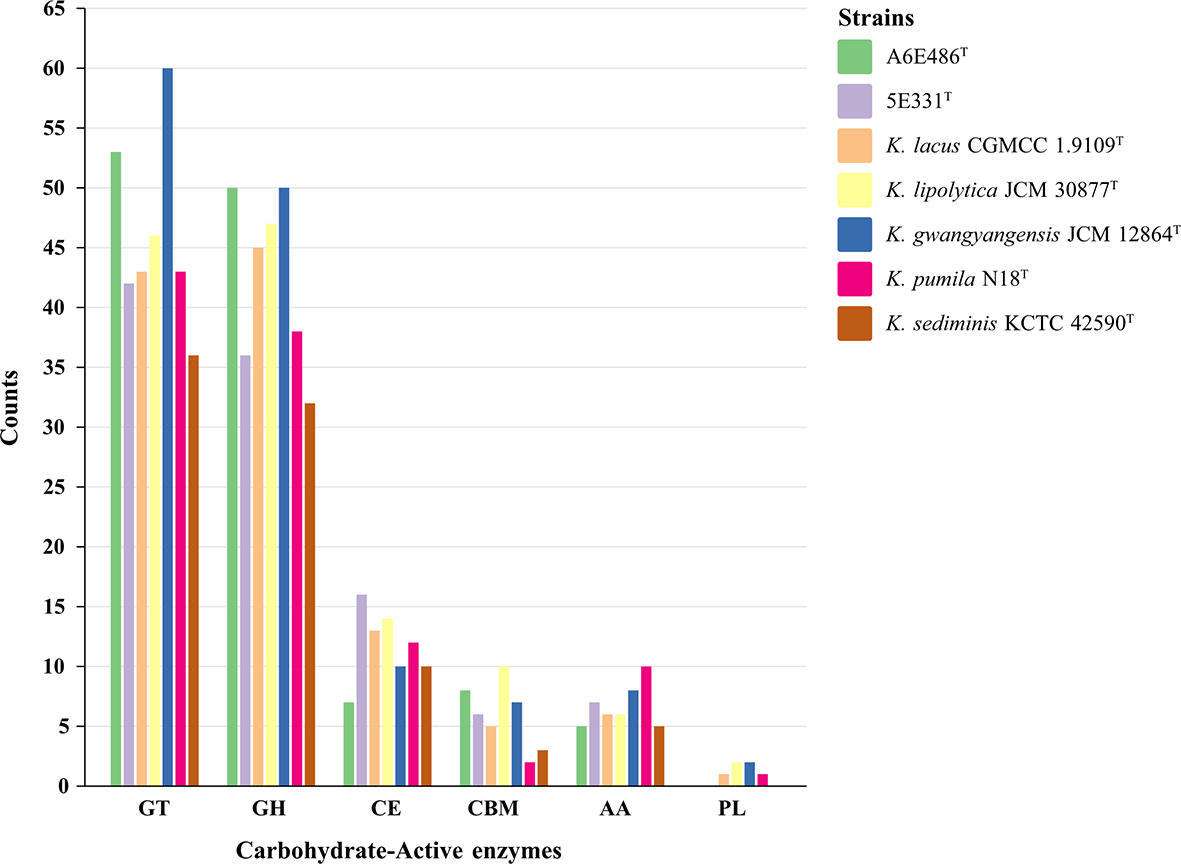 The genome lengths of the seven species of the genus Kordiimonas (strains A6E486T, 5E331T, K. gwangyangensis JCM 30877T, K. lipolytica JCM 12864T, K. lacus CGMCC 1.9109T, K. pumila N18T, and K. sediminis KCTC 42590T) were 3,243,597–4,557,767 bp with a mean size of 3,894,463 bp. The completeness values of these genomes were 99.6%–100.0%. Among them, strain 5E331T had the minimum DNA G+C content (46.2%), while strain A6E486T possessed the maximum content (59.9%). The NCBI PGAP results showed that a total of 3,436 genes were predicted for strain A6E486T, including 3,381 protein-coding genes and 53 RNA genes (46 tRNA genes, 3 rRNA genes, and 4 ncRNA genes), while strain 5E331T had 3,505 predicted genes. The detailed PGAP results of the seven species were shown in Table 3.