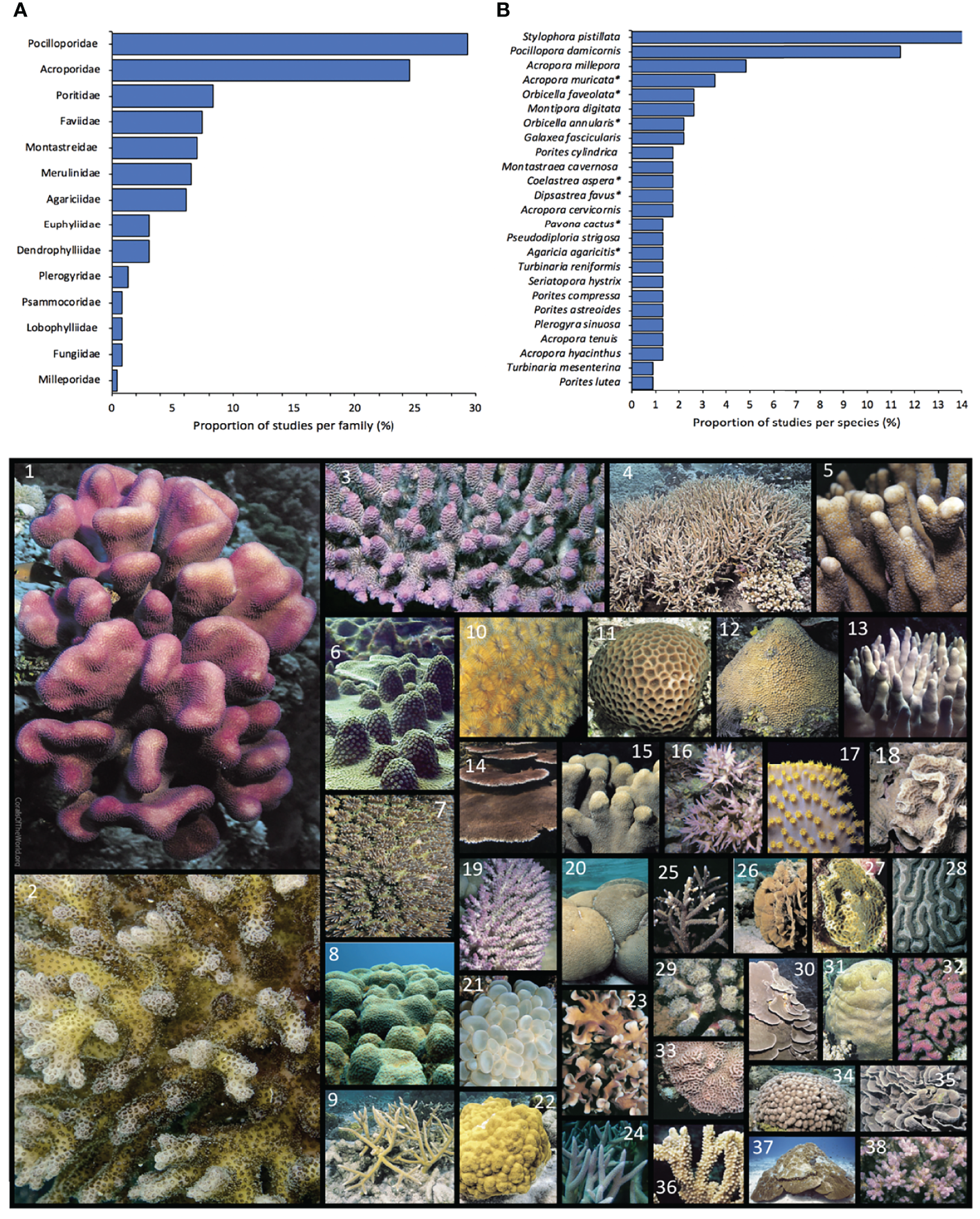 Main coral families (A) and species (B) used on studies looking at the effects of shade and light on corals. Figure below: The dimensions of the coral picture is proportional to the number of studies per species. Species are enumerated from most to least studied respectively. 1: Stylophora pistillata, picture: J. Maragos; 2: Pocillopora damicornis, pic: R. Kelley; 3: Acropora millepora, pic: J. Veron; 4: Acropora muricata*, pic: J. Veron; 5: Montipora digitata, pic: J. Veron; 6: Orbicella faveolata*, pic: E. Weil; 7: Galaxea fascicularis, pic: J. Veron; 8: Orbicella annularis*, pic: E. Weil; 9: Acropora cervicornis, pic: J. Veron; 10: Dipsastrea favus*, pic: J. Veron; 11: Coelastrea aspera*, pic: G Paulay; 12: Monstastraea cavernosa, pic: J. Veron; 13: Porites cylindrica, pic: E. Lovell; 14: Acropora hyacinthus, pic: E Turak; 15: Porites compressa, pic: C. Hunter; 16: Seriatopora hystrix, pic: J. Veron; 17: Turbinaria reniformis, pic: J. Veron; 18: Agaricia agaricites*, pic: J. Veron; 19: Acropora tenuis, pic: J. Veron; 20: Pseudodiploria strigosa*, pic: J. Veron; 21: Plerogyra sinuososa, pic: J. Veron; 22: Porites astreoides, pic: J. Veron; 23: Pavona cactus*, pic: J. Veron; 24: Acropora intermedia, pic: E Turak; 25: Acropora pulchra, pic: J. Veron; 26: Agaricia tenuifolia, pic: J. Veron; 27: Agaricia humilis*, pic: J. Veron; 28: Colpophyllia natans, pic: J. Veron; 29: Fimbriaphyllia paradivisa*, pic: J. Veron; 30: Montipora monasteriata, pic: J Veron; 31: Platygira sinensis, pic: G Allen; 32: Pocillopora verrucosa, pic: J. Veron; 33: Goniastrea pectinata, pic; E. Lovell; 34: Porites furcata, pic: J. Veron; 35: Turbinaria mesenterina, pic: J. Veron; 36: Montipora capitata, pic: J. Veron; 38: Pocillopora acuta*, pic: J. Veron. All pictures were downloaded and slightly modified from Corals of the World Veron et al., 2021. *updated species name based on World Register of Marine Species it might differ with analised studies. Species representing <0.5% of studies were not included.