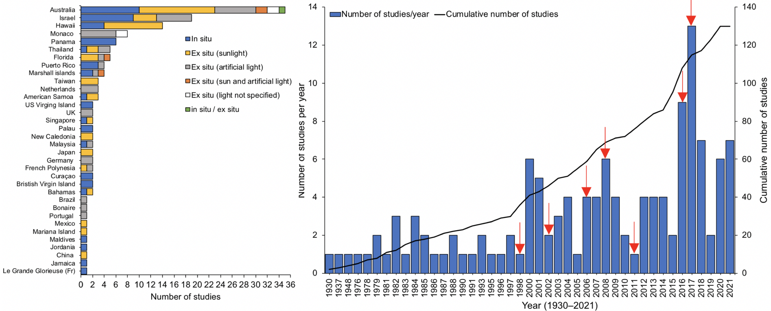 Left: Studies per country, referring to the place (reef or laboratory) and source of light used (natural or artificial). Right: Number of studies and cumulative number of studies looking at the effects of shade or light on corals, red arrows highlight years where massive bleaching events occurred.
