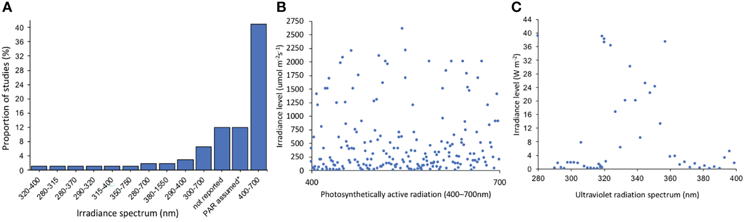 Irradiance spectrum and irradiance levels reported among analysed studies. (A) Proportion of different irradiance spectrum reported by range (nm); (B) Irradiance levels (μmol m-2s-1) specifically for visible light (PAR, 400–700) and (C) Irradiance levels (W m-2) on the ultraviolet radiation spectrum. Note that X axis on graphs b and c are arbitrary for illustration purpose, since most studies report one value along the spectrum range (e.g., PAR: 400–700; UVB: 290–320; UVA: 320–400; UVR: 290–400; UVC: 190–280).